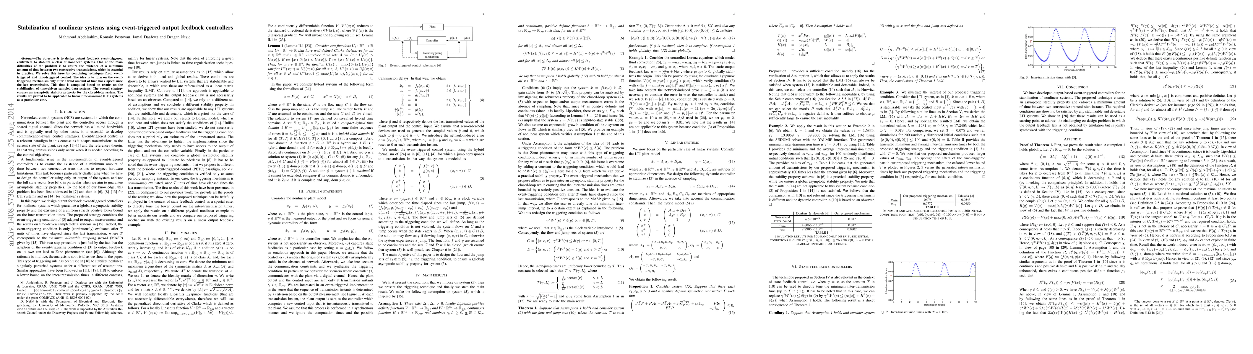 This paper designs output feedback event-triggered controllers to stabilize nonlinear systems, ensuring minimal transmission intervals. It combines event-triggered and time-triggered control techniques to achieve asymptotic stability, with results applicable to linear time-invariant systems as a special case.