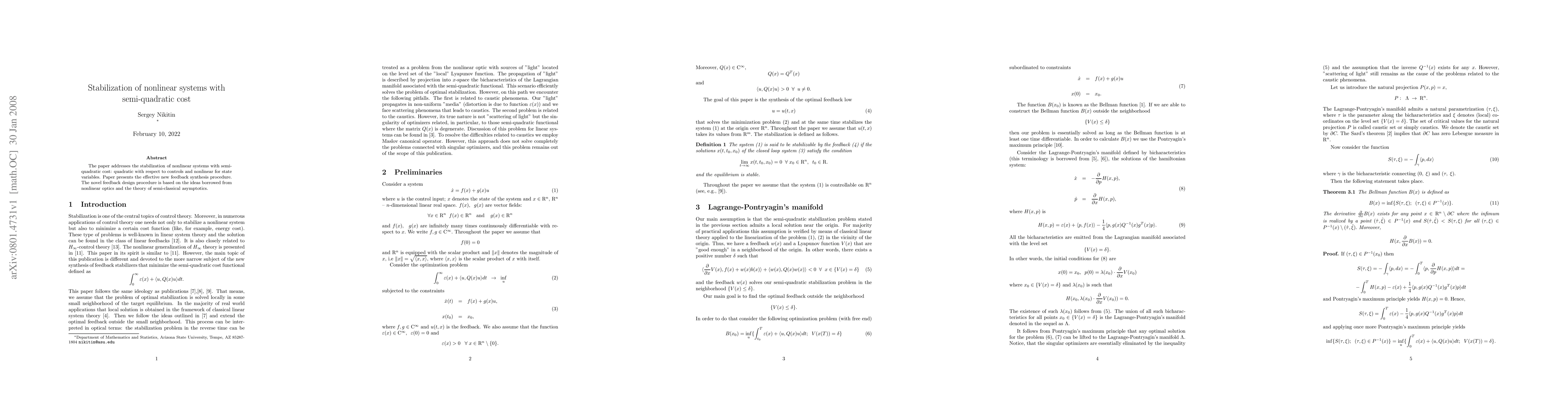 The paper introduces a new method to stabilize nonlinear systems using a semi-quadratic cost function, which is quadratic in controls and nonlinear in states. This approach, inspired by nonlinear optics and semi-classical asymptotics, presents an innovative feedback synthesis procedure.