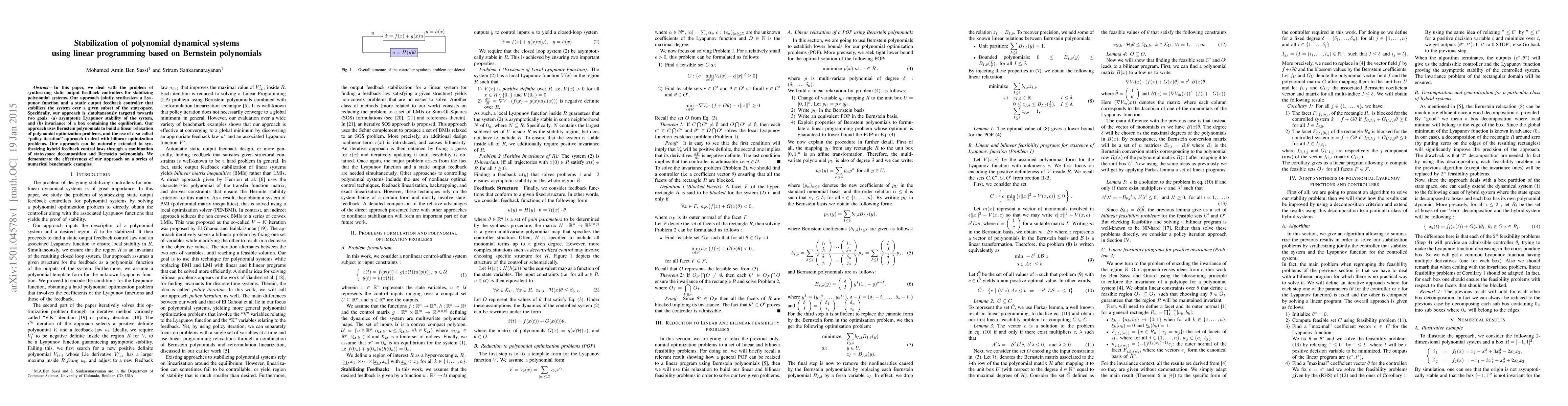 In this paper, we deal with the problem of synthesizing static output feedback controllers for stabilizing polynomial systems. Our approach jointly synthesizes a Lyapunov function and a static output feedback controller that stabilizes the system over a given subset of the state-space. Specifically, our approach is simultaneously targeted towards two goals: (a) asymptotic Lyapunov stability of the system, and (b) invariance of a box containing the equilibrium. Our approach uses Bernstein polynomials to build a linear relaxation of polynomial optimization problems, and the use of a so-called "policy iteration" approach to deal with bilinear optimization problems. Our approach can be naturally extended to synthesizing hybrid feedback control laws through a combination of state-space decomposition and Bernstein polynomials. We demonstrate the effectiveness of our approach on a series of numerical benchmark examples.