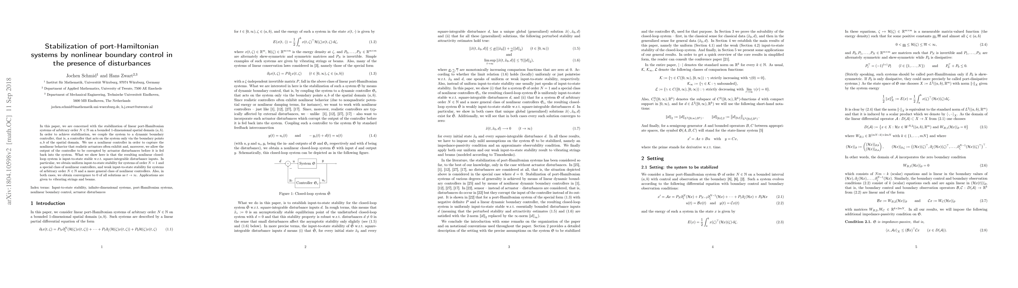 This paper investigates the stabilization of linear port-Hamiltonian systems via nonlinear boundary control, demonstrating input-to-state stability in the presence of actuator disturbances. It provides uniform stability for first-order systems and weak stability for higher-order systems, with all solutions converging to zero as time approaches infinity.