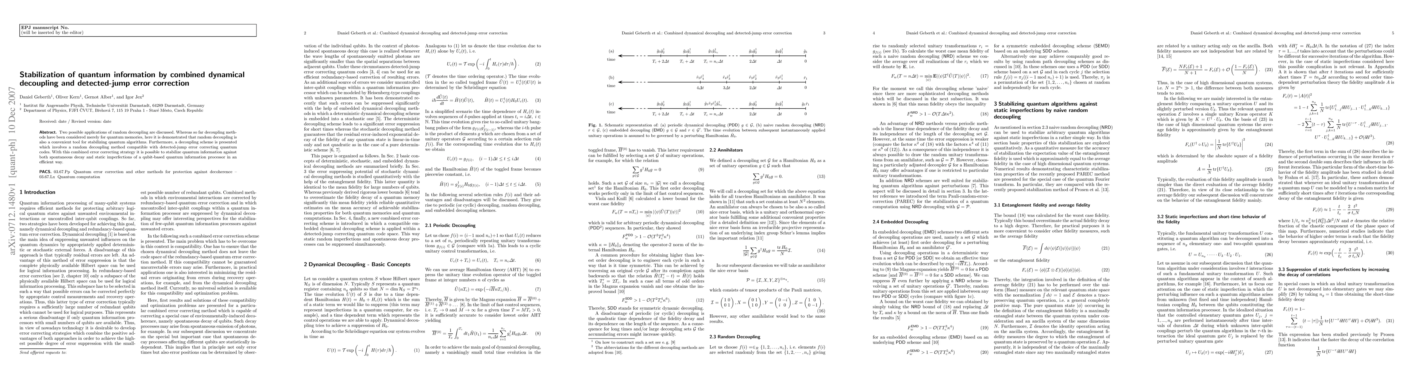 This paper explores the stabilization of quantum information through a combination of dynamical decoupling and detected-jump error correction, demonstrating its efficacy in both quantum memories and algorithms. The proposed method integrates random decoupling with error-correcting codes to efficiently counteract spontaneous decay and static imperfections in qubit-based quantum processors.