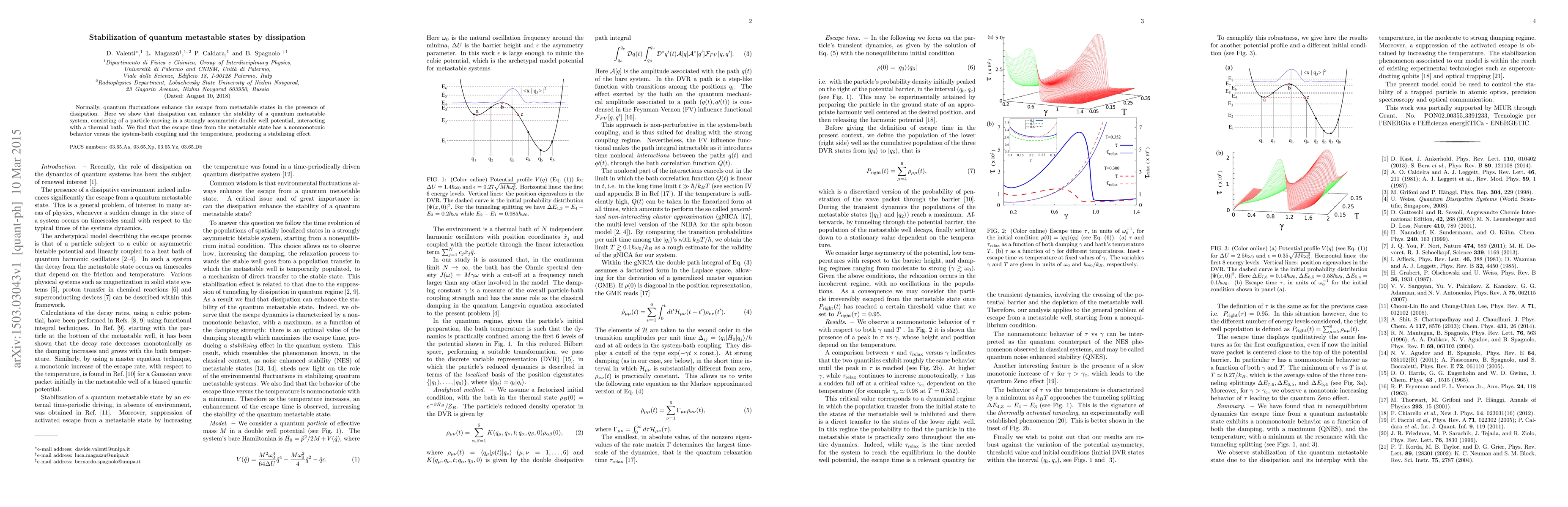 This research demonstrates that dissipation can paradoxically enhance the stability of quantum metastable states in a particle within a strongly asymmetric double well potential, contrary to the usual effect of quantum fluctuations. The escape time exhibits nonmonotonic behavior with system-bath coupling and temperature, revealing a stabilizing effect.