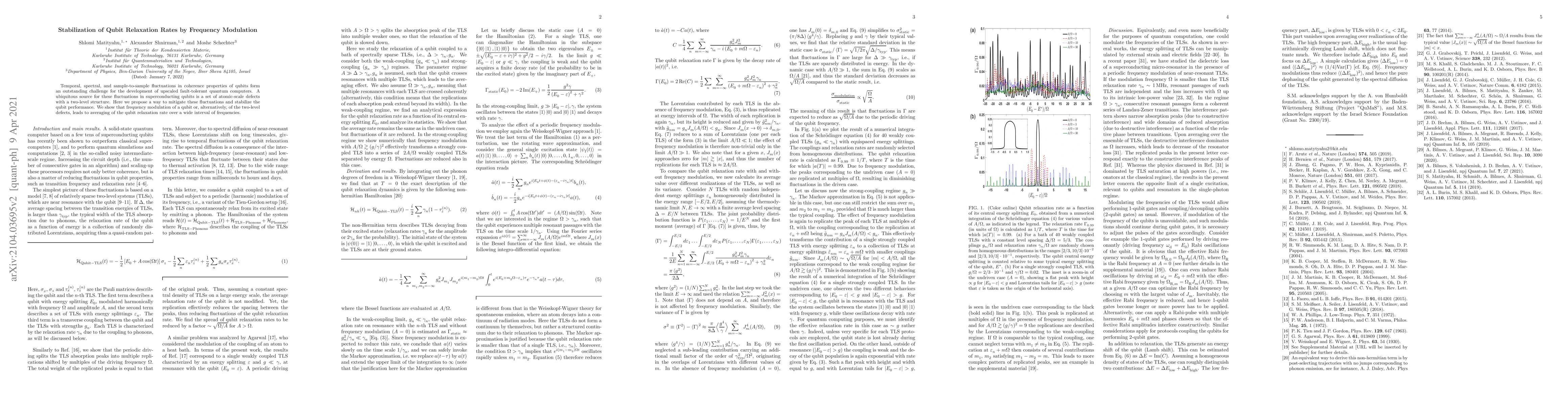 Temporal, spectral, and sample-to-sample fluctuations in coherence properties of qubits form an outstanding challenge for the development of upscaled fault-tolerant quantum computers. A ubiquitous source for these fluctuations in superconducting qubits is a set of atomic-scale defects with a two-level structure. Here we propose a way to mitigate these fluctuations and stabilize the qubit performance. We show that frequency modulation of a qubit or, alternatively, of the two-level defects, leads to averaging of the qubit relaxation rate over a wide interval of frequencies.