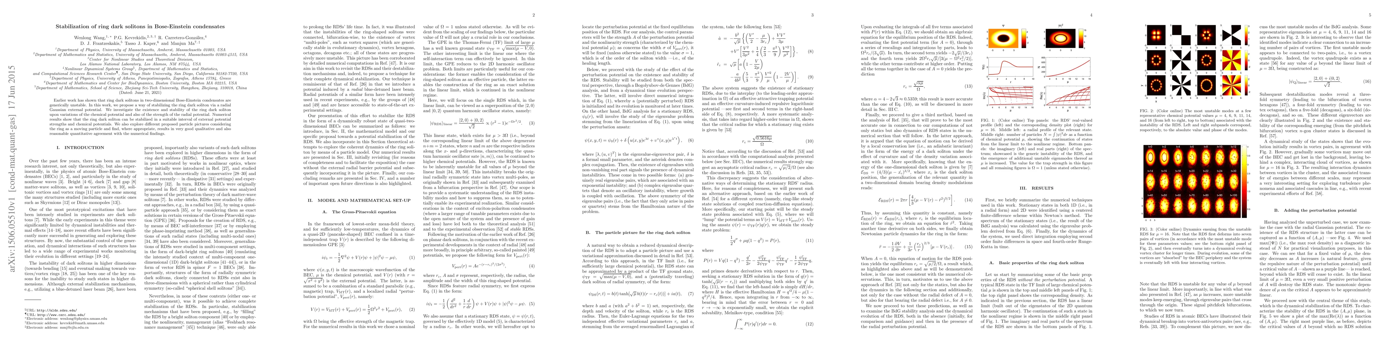 This paper proposes a method to stabilize ring dark solitons in two-dimensional Bose-Einstein condensates using a radial Gaussian external potential. Numerical results confirm the soliton's stability under specific conditions of chemical potential and potential strength, with good agreement between theoretical and numerical models.