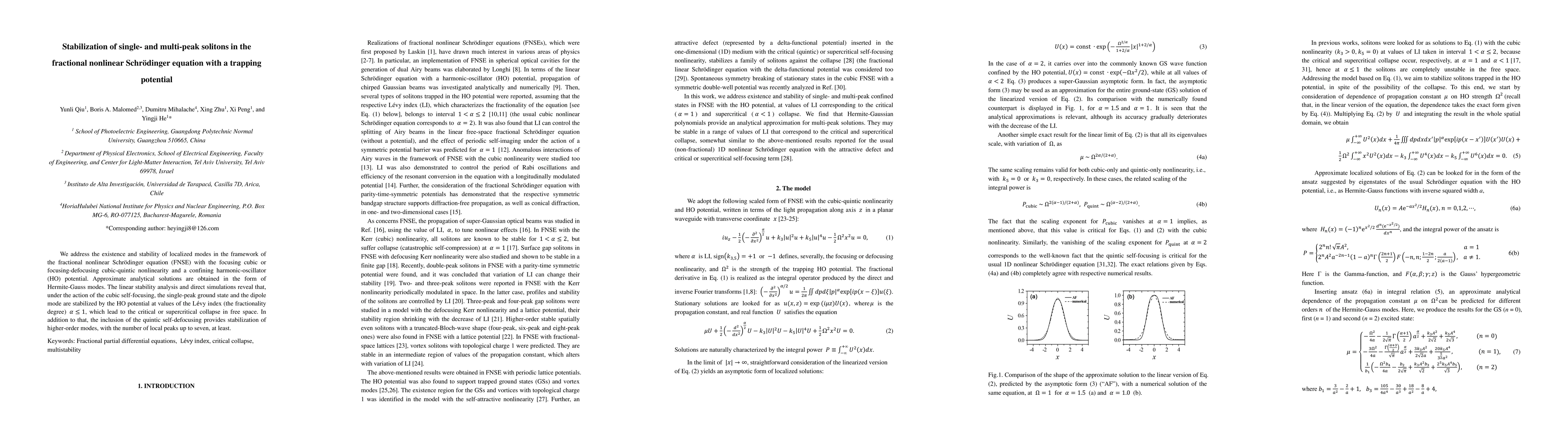 Researchers studied the stability of solitons in a modified version of the nonlinear Schrödinger equation with a trapping potential, finding that certain values of the Levy index can stabilize single-peak and multi-peak modes.