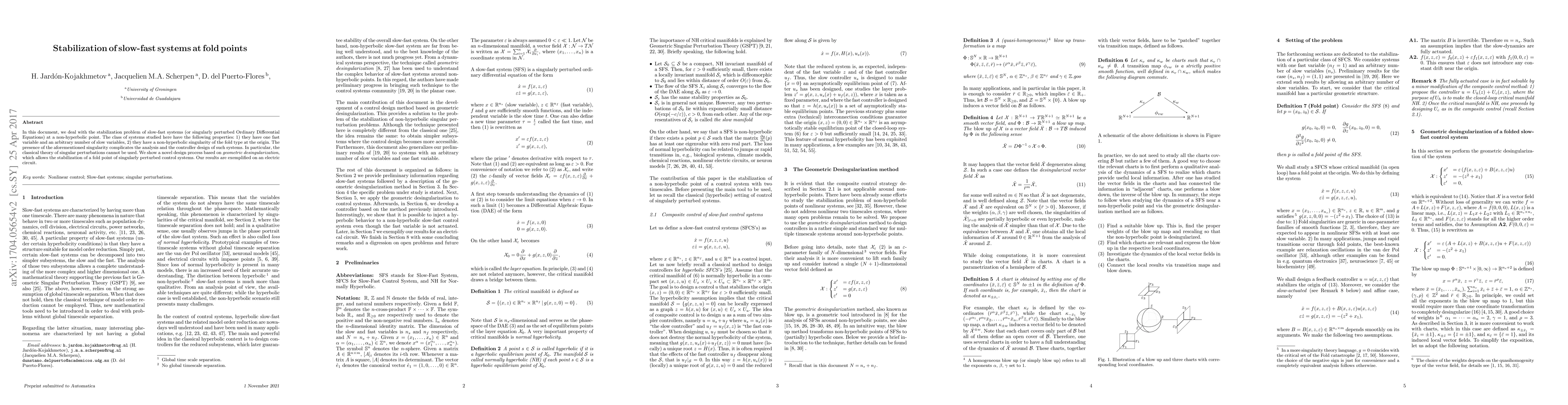 This paper presents a novel stabilization method for slow-fast systems with fold singularities, using geometric desingularization instead of classical singular perturbation theory. The approach is demonstrated through the stabilization of a fold point in an electric circuit model.