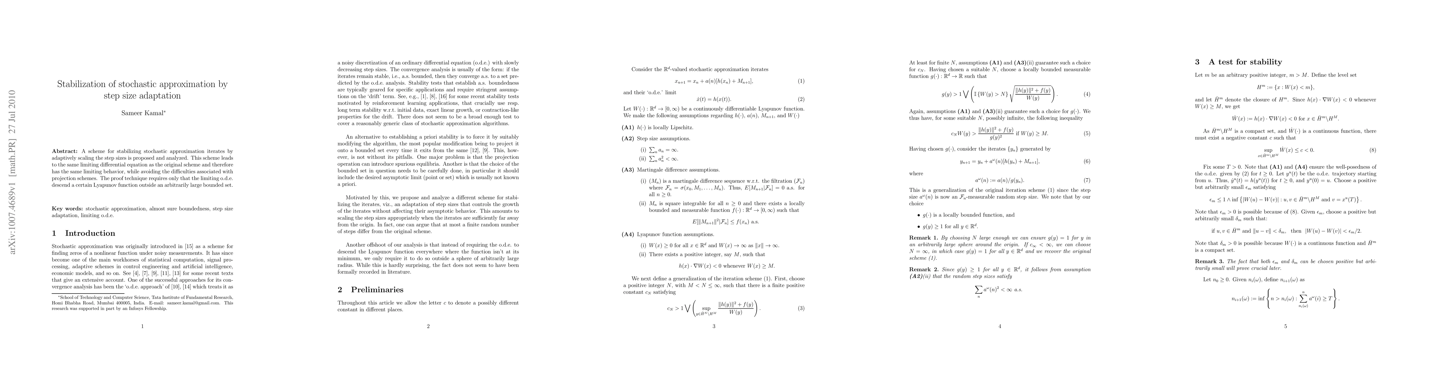 A new method for stabilizing stochastic approximation iterates is proposed, adapting step sizes to avoid difficulties with projection schemes while maintaining the same limiting behavior as original methods.