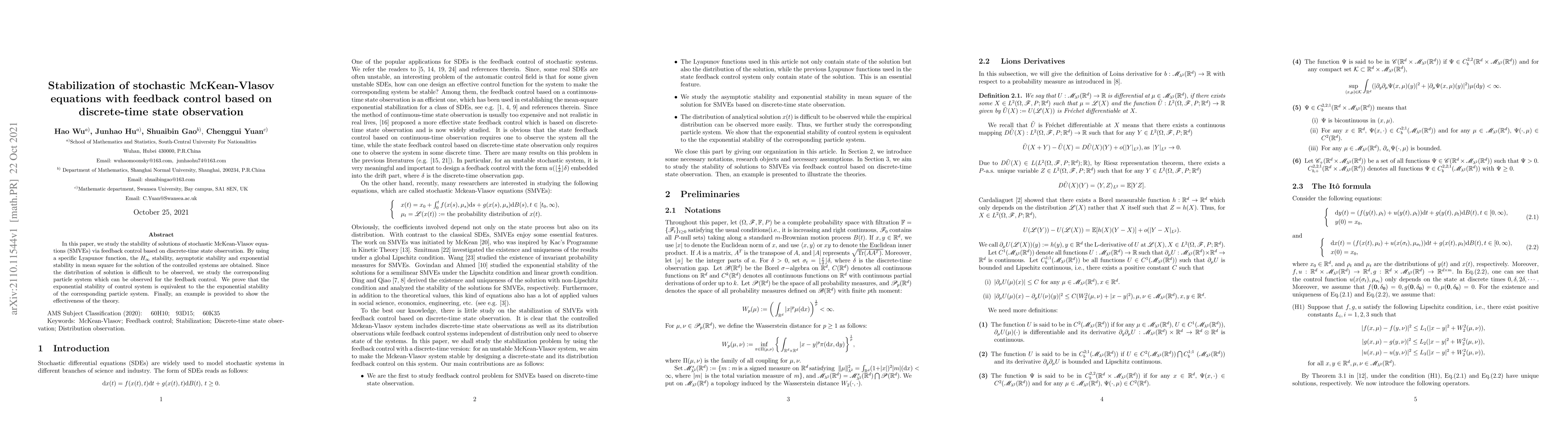 This paper studies the stability of stochastic McKean-Vlasov equations with feedback control based on discrete-time state observation, showing that exponential stability is equivalent to the corresponding particle system's stability.