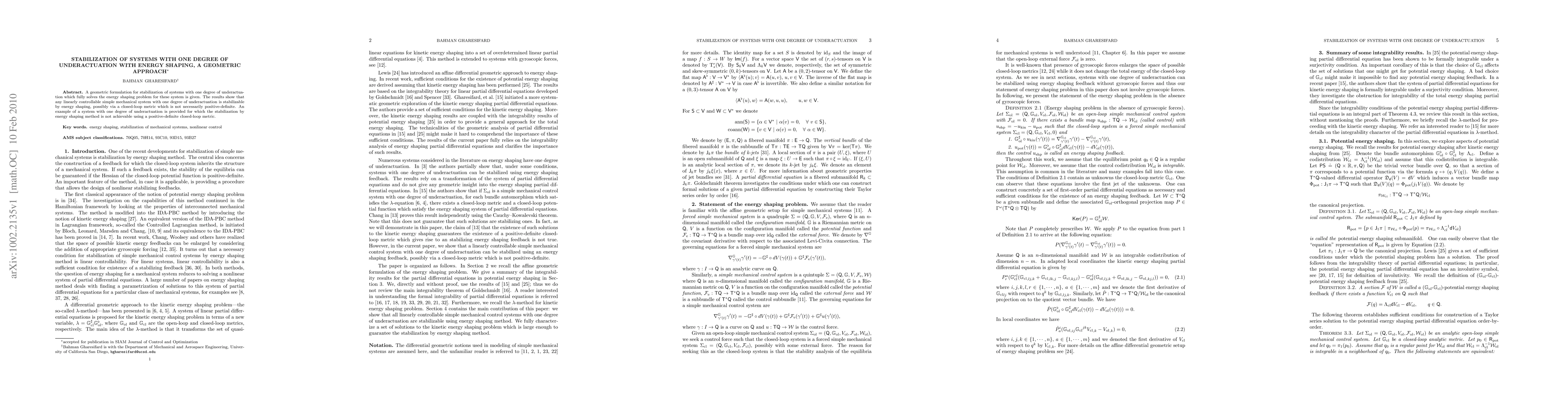 This paper presents a geometric approach to stabilize systems with one degree of underactuation through energy shaping, demonstrating that such systems can be stabilized even with non-positive definite closed-loop metrics. An example is provided showing that some systems cannot be stabilized using only positive-definite metrics.