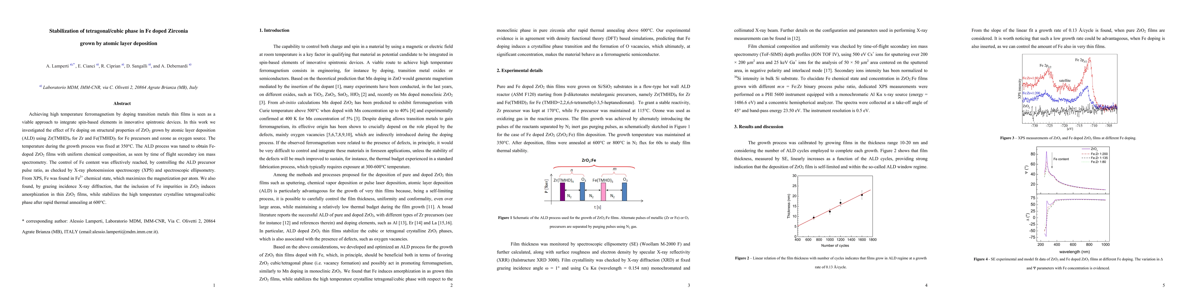 This research investigates Fe doping in ZrO2 thin films grown via atomic layer deposition. Key findings include controlled Fe content through ALD pulse ratio, Fe3+ state maximizing magnetization, and stabilization of tetragonal/cubic phase in ZrO2 after annealing, despite amorphization in thin films.