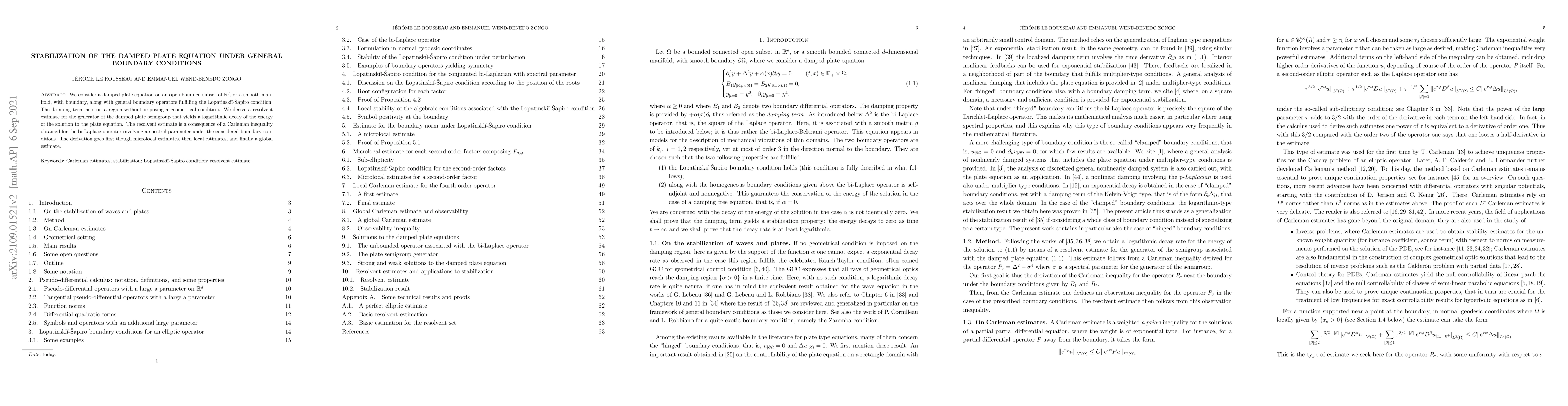 We consider a damped plate equation on an open bounded subset of R^d, or a smooth manifold, with boundary, along with general boundary operators fulfilling the Lopatinskii-Sapiro condition. The damping term acts on a region without imposing a geometrical condition. We derive a resolvent estimate for the generator of the damped plate semigroup that yields a logarithmic decay of the energy of the solution to the plate equation. The resolvent estimate is a consequence of a Carleman inequality obtained for the bi-Laplace operator involving a spectral parameter under the considered boundary conditions. The derivation goes first though microlocal estimates, then local estimates, and finally a global estimate.