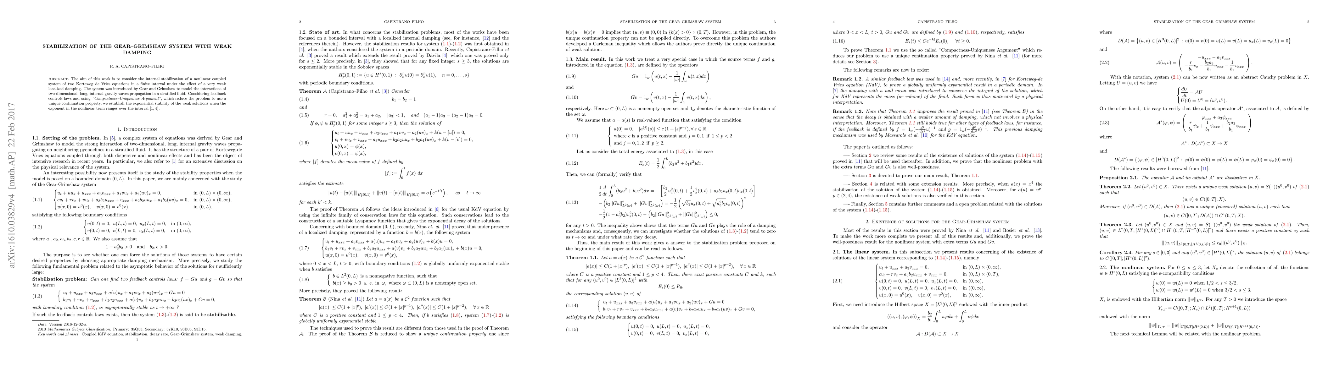 This paper investigates the internal stabilization of the Gear-Grimshaw system, a coupled nonlinear system of Korteweg-de Vries equations, under weak localized damping. Using feedback control laws and the Compactness-Uniqueness Argument, the authors establish exponential stability for weak solutions within a specified range of nonlinear terms.