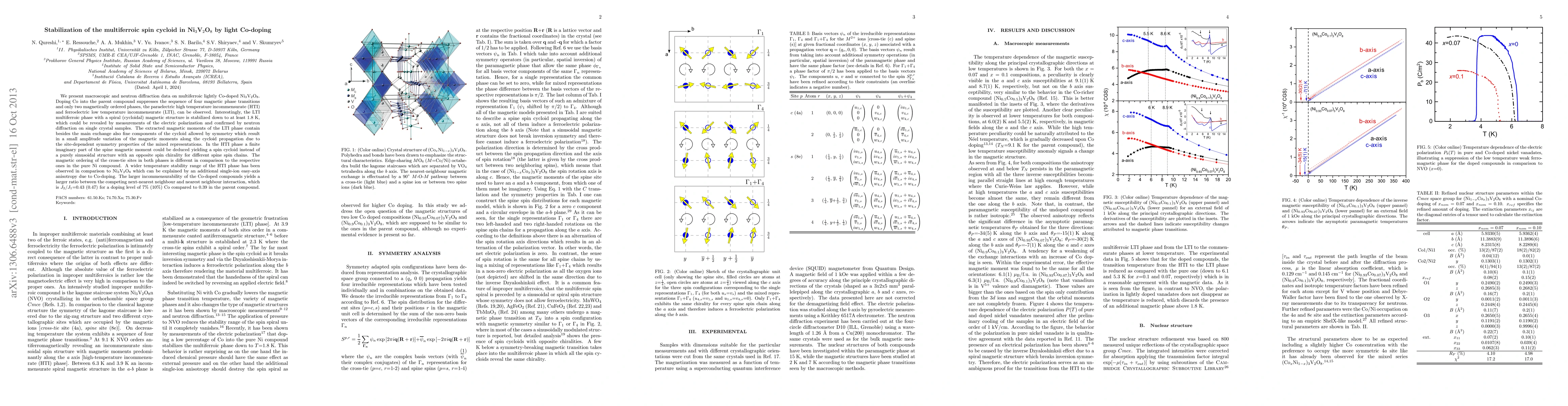 We present macroscopic and neutron diffraction data on multiferroic lightly Co-doped Ni$_3$V$_2$O$_8$. Doping Co into the parent compound suppresses the sequence of four magnetic phase transitions and only two magnetically ordered phases, the paraelectric high temperature incommensurate (HTI) and ferroelectric low temperature incommensurate (LTI), can be observed. Interestingly, the LTI multiferroic phase with a spiral (cycloidal) magnetic structure is stabilized down to at least 1.8 K, which could be revealed by measurements of the electric polarization and confirmed by neutron diffraction on single crystal samples. The extracted magnetic moments of the LTI phase contain besides the main exchange also fine components of the cycloid allowed by symmetry which result in a small amplitude variation of the magnetic moments along the cycloid propagation due to the site-dependent symmetry properties of the mixed representations. In the HTI phase a finite imaginary part of the spine magnetic moment could be deduced yielding a spin cycloid instead of a purely sinusoidal structure with an opposite spin chirality for different spine spin chains. The magnetic ordering of the cross-tie sites in both phases is different in comparison to the respective ones in the pure Ni compound. A wider temperature stability range of the HTI phase has been observed in comparison to Ni$_3$V$_2$O$_8$ which can be explained by an additional single-ion easy-axis anisotropy due to Co-doping. The larger incommensurability of the Co-doped compounds yields a larger ratio between the competing next-nearest neighbour and nearest neighbour interaction, which is $J_2/J_1$=0.43 (0.47) for a doping level of 7% (10%) Co compared to 0.39 in the parent compound.