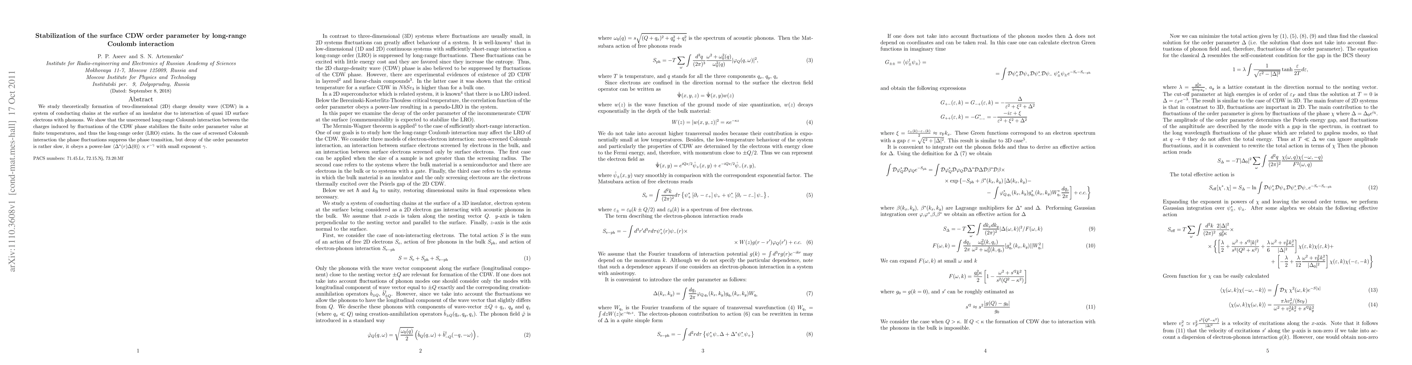 We study theoretically formation of two-dimensional (2D) charge density wave (CDW) in a system of conducting chains at the surface of an insulator due to interaction of quasi 1D surface electrons with phonons. We show that the unscreened long-range Coloumb interaction between the charges induced by fluctuations of the CDW phase stabilizes the finite order parameter value at finite temperatures, and thus the long-range order (LRO) exists. In the case of screened Coloumb interaction the phase fluctuations suppress the phase transition, but decay of the order parameter is rather slow, it obeys a power-law $<\Delta^*(r) \Delta(0)> \propto r^{-\gamma}$ with small exponent $\gamma$