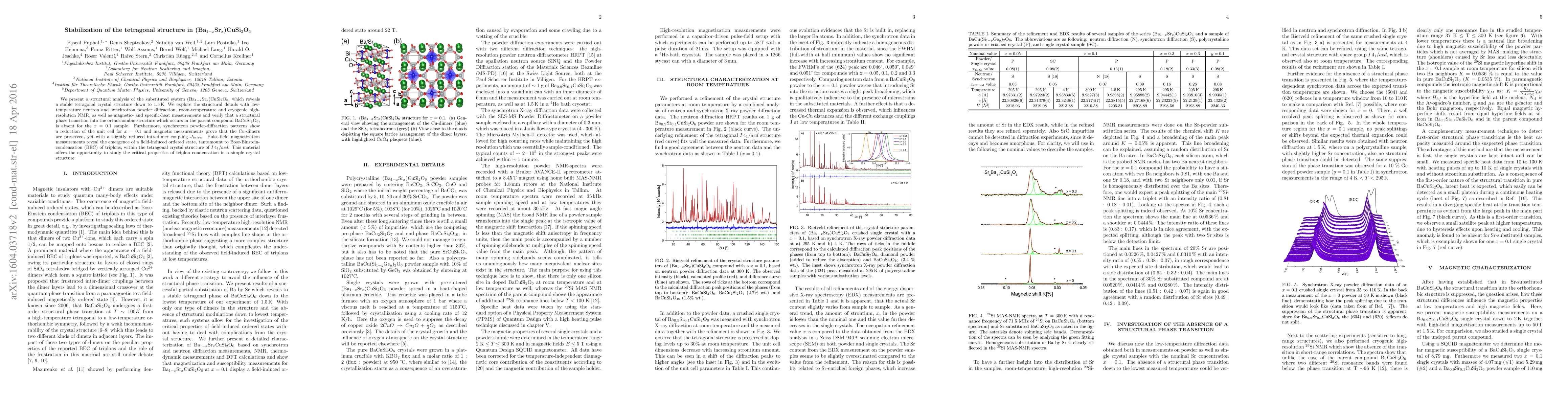 We present a structural analysis of the substituted system (Ba$_{1-x}$Sr$_{x}$)CuSi$_{2}$O$_{6}$, which reveals a stable tetragonal crystal structure down to 1.5 K. We explore the structural details with lowtemperature neutron and synchrotron powder diffraction, room-temperature and cryogenic highresolution NMR, as well as magnetic- and specific-heat measurements and verify that a structural phase transition into the orthorhombic structure which occurs in the parent compound BaCuSi2O6, is absent for the x = 0.1 sample. Furthermore, synchrotron powder-diffraction patterns show a reduction of the unit cell for x = 0.1 and magnetic measurements prove that the Cu-dimers are preserved, yet with a slightly reduced intradimer coupling Jintra. Pulse-field magnetization measurements reveal the emergence of a field-induced ordered state, tantamount to Bose-Einsteincondensation (BEC) of triplons, within the tetragonal crystal structure of $I\,4_{1}/acd$. This material offers the opportunity to study the critical properties of triplon condensation in a simple crystal structure.