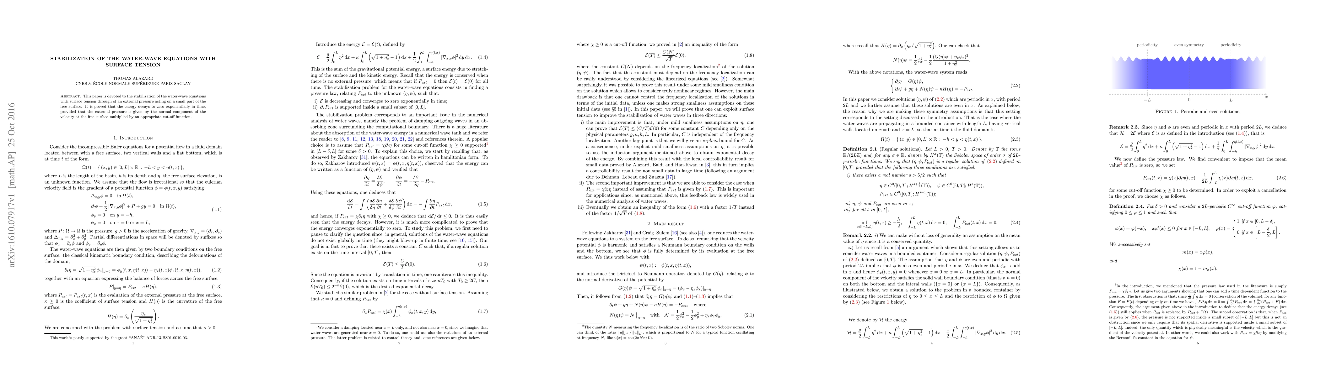 This research proves that the water-wave equations with surface tension can be stabilized exponentially using an external pressure applied to a small free surface area. The pressure is a product of the velocity normal component at the free surface and a specific cut-off function.