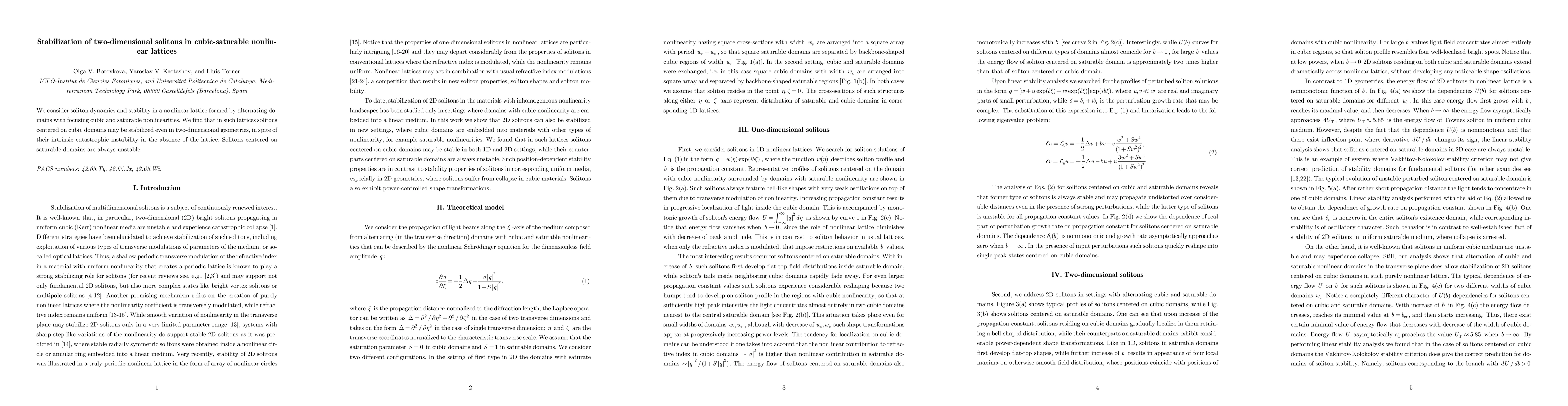 This paper investigates soliton dynamics and stability in a nonlinear lattice with alternating cubic and saturable nonlinear domains, finding that solitons in cubic domains can stabilize in two-dimensional geometries despite inherent instability, while those in saturable domains remain unstable.