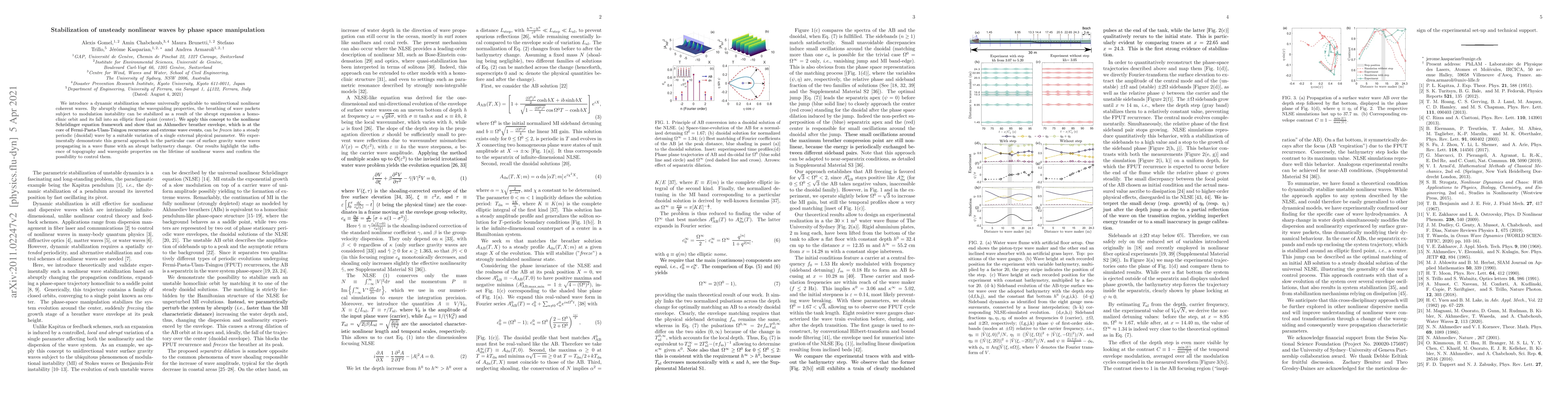 We introduce a dynamic stabilization scheme universally applicable to unidirectional nonlinear coherent waves. By abruptly changing the waveguiding properties, the breathing of wave packets subject to modulation instability can be stabilized as a result of the abrupt expansion a homoclinic orbit and its fall into an elliptic fixed point (center). We apply this concept to the nonlinear Schr\"odinger equation framework and show that an Akhmediev breather envelope, which is at the core of Fermi-Pasta-Ulam-Tsingou recurrence and extreme wave events, can be frozen into a steady periodic (dnoidal) wave by a suitable variation of a single external physical parameter. We experimentally demonstrate this general approach in the particular case of surface gravity water waves propagating in a wave flume with an abrupt bathymetry change. Our results highlight the influence of topography and waveguide properties on the lifetime of nonlinear waves and confirm the possibility to control them.