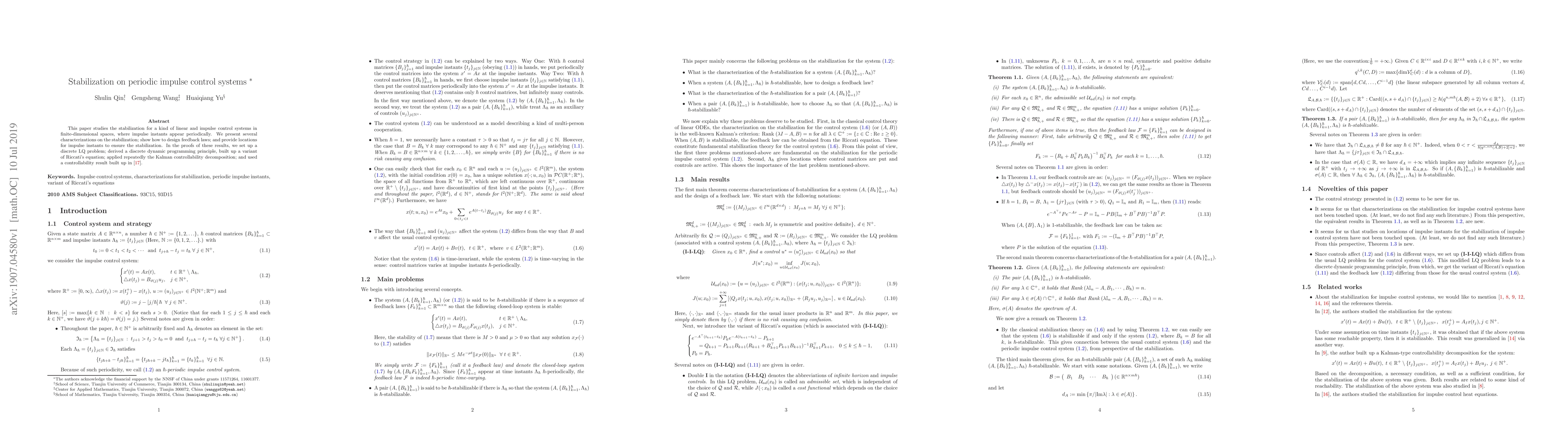 This paper studies the stabilization for a kind of linear and impulse control systems in finite-dimensional spaces, where impulse instants appear periodically. We present several characterizations on the stabilization; show how to design feedback laws; and provide locations for impulse instants to ensure the stabilization. In the proofs of these results, we set up a discrete LQ problem; derived a discrete dynamic programming principle, built up a variant of Riccati's equation; applied repeatedly the Kalman controllability decomposition; and used a controllability result built up in [17].