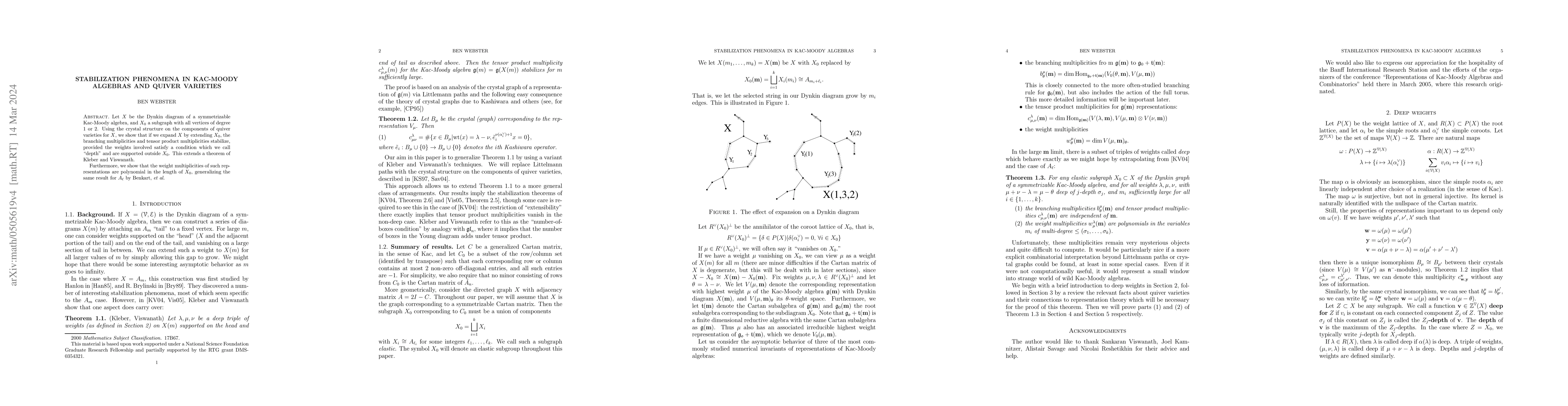 Researchers study stabilization phenomena in Kac-Moody algebras and quiver varieties, finding that branching multiplicities stabilize when certain weights are supported outside a specific subgraph of the Dynkin diagram, with implications for representation theory.