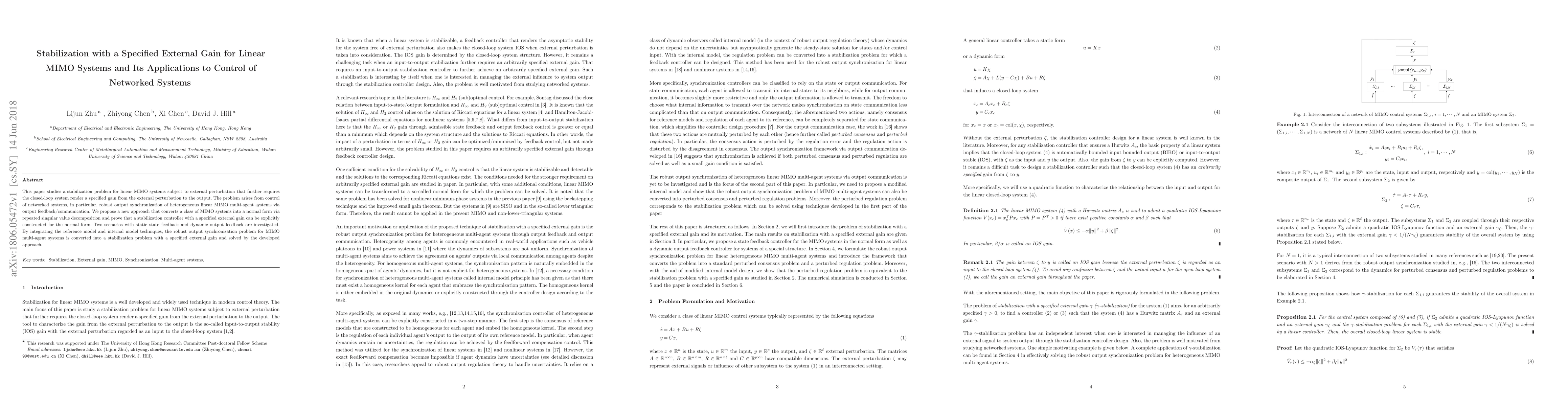 This paper proposes a method to stabilize linear MIMO systems with a specified external gain, addressing robust output synchronization in networked systems. The approach converts MIMO systems into a normal form using singular value decomposition and constructs a stabilization controller, applicable for both static and dynamic output feedback.