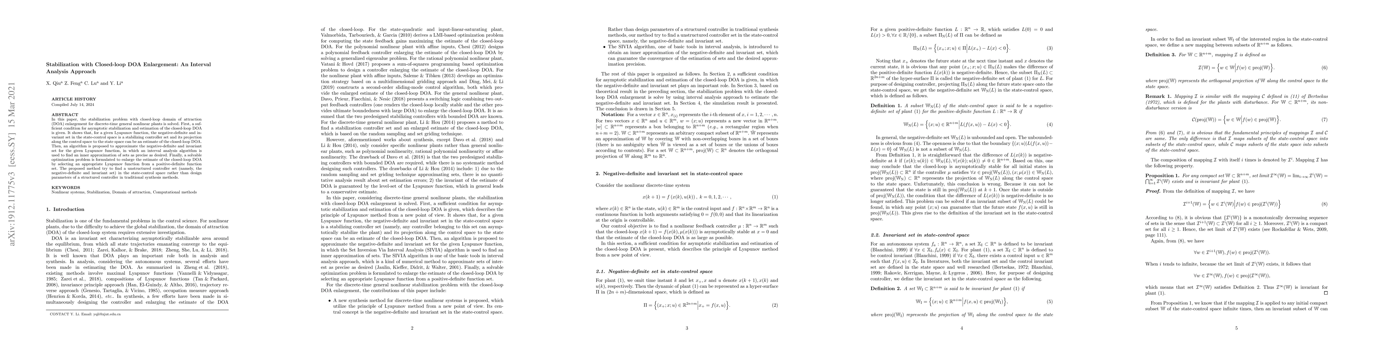 This paper proposes a method for stabilizing discrete-time nonlinear plants by enlarging the closed-loop domain of attraction using interval analysis. It introduces a sufficient condition for stabilization and an algorithm to approximate stabilizing controller sets, aiming to enhance the domain of attraction through appropriate Lyapunov function selection.