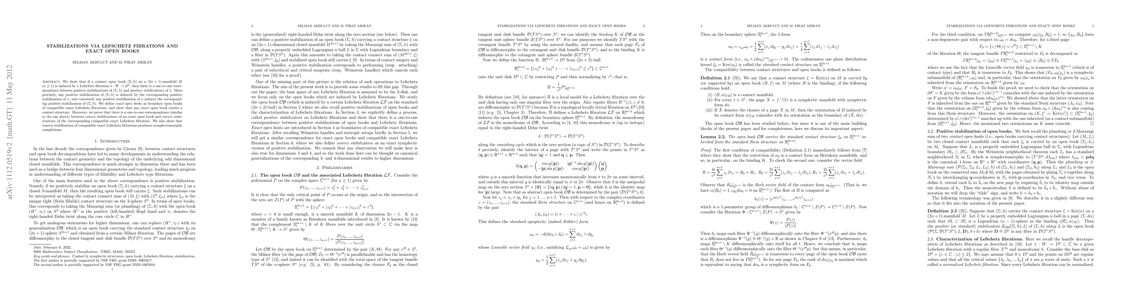 The paper establishes a one-to-one correspondence between positive stabilizations of contact open books induced by Lefschetz fibrations and their corresponding fibrations. It also introduces exact open books, proves they carry contact structures, and shows a similar correspondence between convex stabilizations of exact open books and compatible exact Lefschetz fibrations, concluding with symplectomorphic completions from convex stabilizations.
