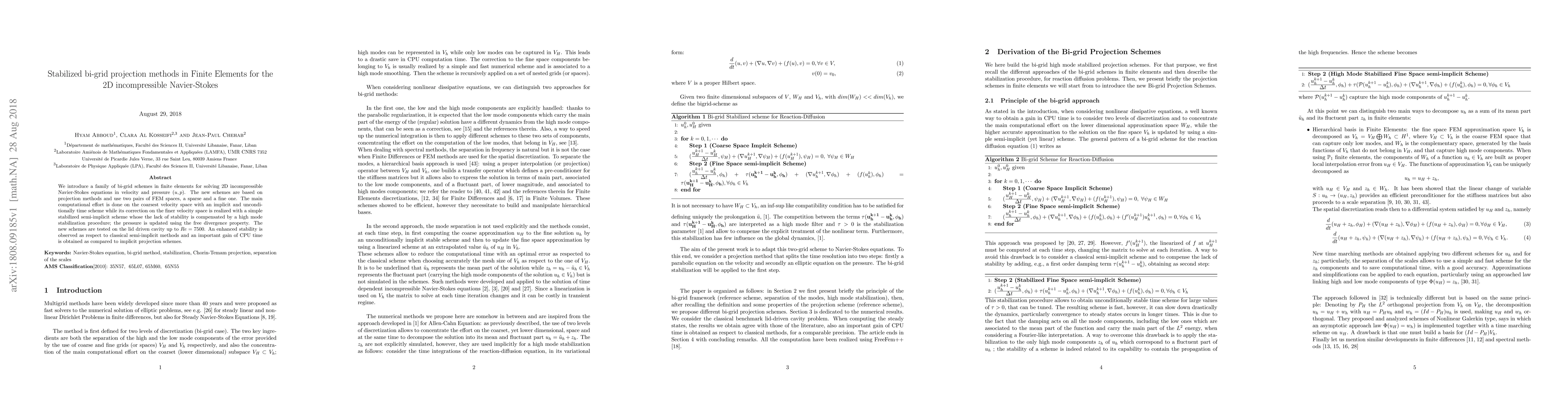 We introduce a family of bi-grid schemes in finite elements for solving 2D incompressible Navier-Stokes equations in velocity and pressure $(u,p)$. The new schemes are based on projection methods and use two pairs of FEM spaces, a sparse and a fine one. The main computational effort is done on the coarsest velocity space with an implicit and unconditionally time scheme while its correction on the finer velocity space is realized with a simple stabilized semi-implicit scheme whose the lack of stability is compensated by a high mode stabilization procedure; the pressure is updated using the free divergence property. The new schemes are tested on the lid driven cavity up to $Re=7500$. An enhanced stability is observed as respect to classical semi-implicit methods and an important gain of CPU time is obtained as compared to implicit projection schemes.