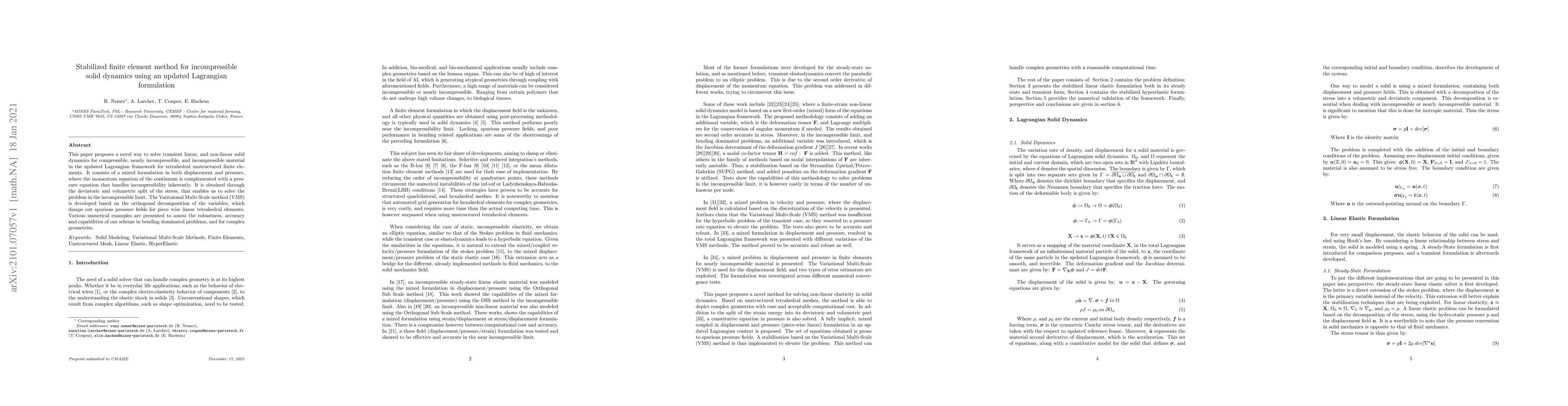 This paper introduces a stabilized finite element method for incompressible solid dynamics using an updated Lagrangian formulation, employing a mixed formulation with a pressure equation to handle incompressibility. The Varitaional Multi-Scale method (VMS) is used to dampen spurious pressure fields, and numerical examples demonstrate the method's robustness and accuracy for complex geometries.