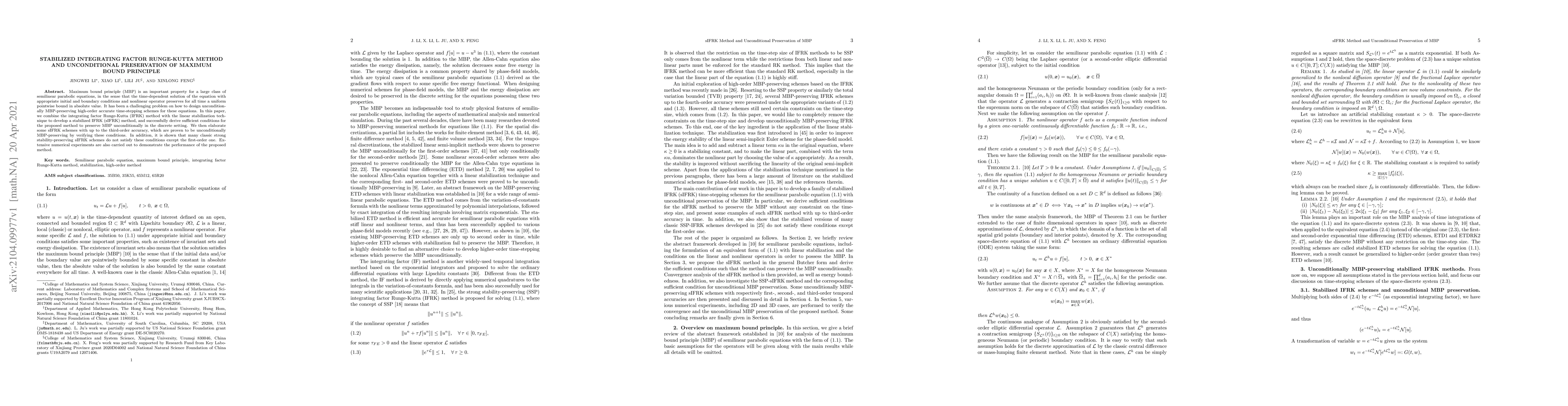 Maximum bound principle (MBP) is an important property for a large class of semilinear parabolic equations, in the sense that the time-dependent solution of the equation with appropriate initial and boundary conditions and nonlinear operator preserves for all time a uniform pointwise bound in absolute value. It has been a challenging problem on how to design unconditionally MBP-preserving high-order accurate time-stepping schemes for these equations. In this paper, we combine the integrating factor Runge-Kutta (IFRK) method with the linear stabilization technique to develop a stabilized IFRK (sIFRK) method, and successfully derive sufficient conditions for the proposed method to preserve MBP unconditionally in the discrete setting. We then elaborate some sIFRK schemes with up to the third-order accuracy, which are proven to be unconditionally MBP-preserving by verifying these conditions. In addition, it is shown that many classic strong stability-preserving sIFRK schemes do not satisfy these conditions except the first-order one. Extensive numerical experiments are also carried out to demonstrate the performance of the proposed method.