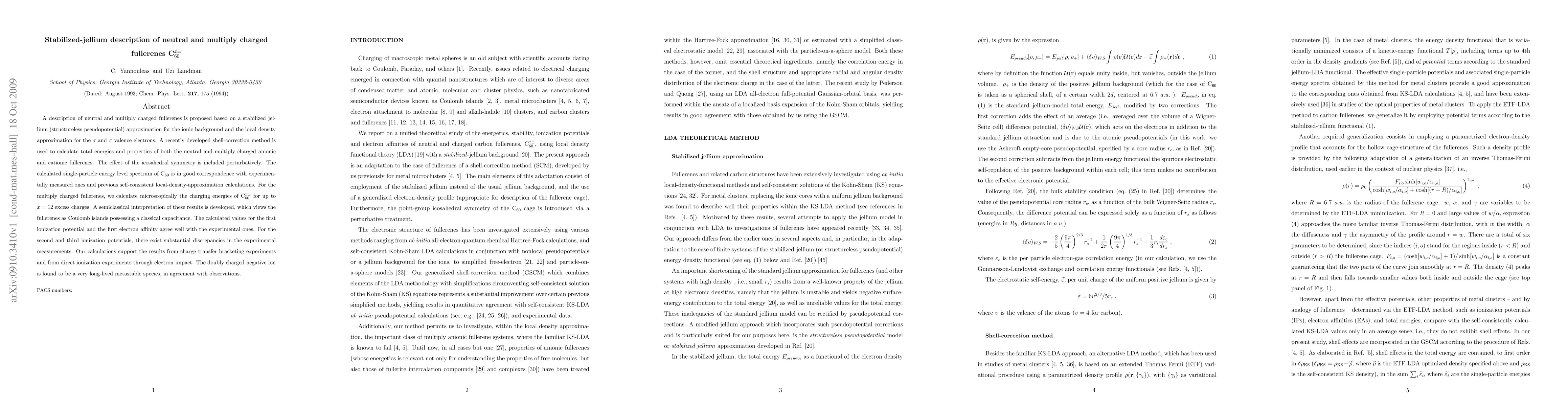 This paper proposes a stabilized-jellium model for neutral and multiply charged fullerenes, using a shell-correction method to calculate their total energies and properties. The model accurately predicts the single-particle energy levels of C_60 and the charging energies for up to 12 excess charges, supporting experimental observations and indicating the long-lived nature of doubly charged negative ions.
