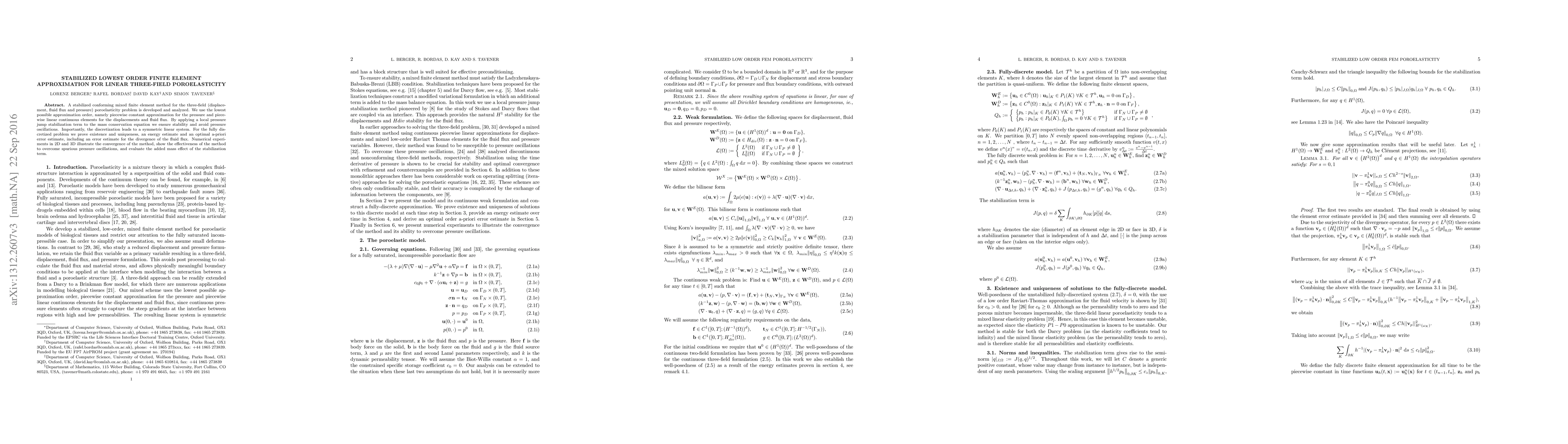 This paper develops a stabilized lowest order finite element method for linear three-field poroelasticity, ensuring stability through a local pressure jump stabilization term. The method proves existence, uniqueness, and optimal error estimates, and numerical experiments demonstrate its effectiveness in avoiding spurious pressure oscillations.