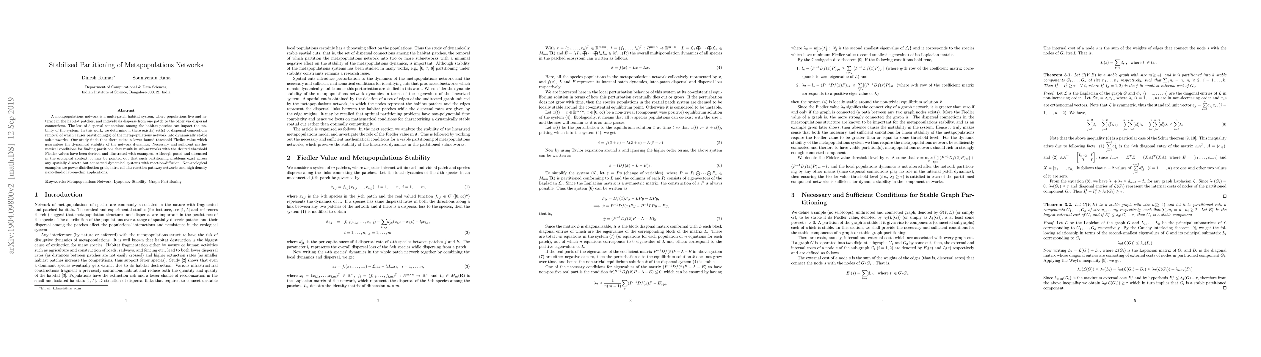 A metapopulations network is a multi-patch habitat system, where populations live and interact in the habitat patches, and individuals disperse from one patch to the other via dispersal connections. The loss of dispersal connections among the habitat patches can impact the stability of the system. In this work, we determine if there exist(s) set(s) of dispersal connections removal of which causes partitioning(s) of the metapopulations network into dynamically stable sub-networks. Our study finds that there exists a lower bound threshold Fiedler value which guarantees the dynamical stability of the network dynamics. Necessary and sufficient mathematical conditions for finding partitions that result in sub-networks with the desired threshold Fiedler values have been derived and illustrated with examples. Although posed and discussed in the ecological context, it may be pointed out that such partitioning problems exist across any spatially discrete but connected dynamical systems with reaction-diffusion. Non-ecological examples are power distribution grids, intra-cellular reaction pathway networks and high density nano-fluidic lab-on-chip applications.