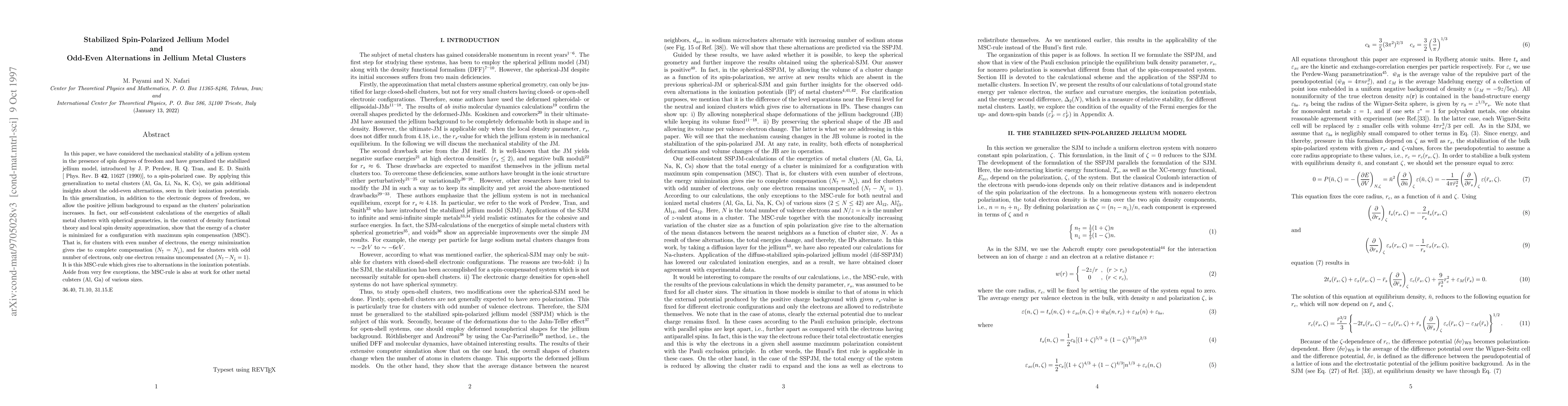 In this paper, we have considered the mechanical stability of a jellium system in the presence of spin degrees of freedom and have generalized the stabilized jellium model, introduced by J. P. Perdew, H. Q. Tran, and E. D. Smith [Phys. Rev. B42, 11627 (1990)], to a spin-polarized case. By applying this generalization to metal clusters (Al, Ga, Li, Na, K, Cs), we gain additional insights about the odd-even alternations, seen in their ionization potentials. In this generalization, in addition to the electronic degrees of freedom, we allow the positive jellium background to expand as the clusters' polarization increases. In fact, our self-consistent calculations of the energetics of alkali metal clusters with spherical geometries, in the context of density functional theory and local spin density approximation, show that the energy of a cluster is minimized for a configuration with maximum spin compensation (MSC). That is, for clusters with even number of electrons, the energy minimization gives rise to complete compensation ($N_\uparrow=N_\downarrow$), and for clusters with odd number of electrons, only one electron remains uncompensated ($N_\uparrow-N_\downarrow=1$). It is this MSC-rule which gives rise to alternations in the ionization potentials. Aside from very few exceptions, the MSC-rule is also at work for other metal culsters (Al, Ga) of various sizes.