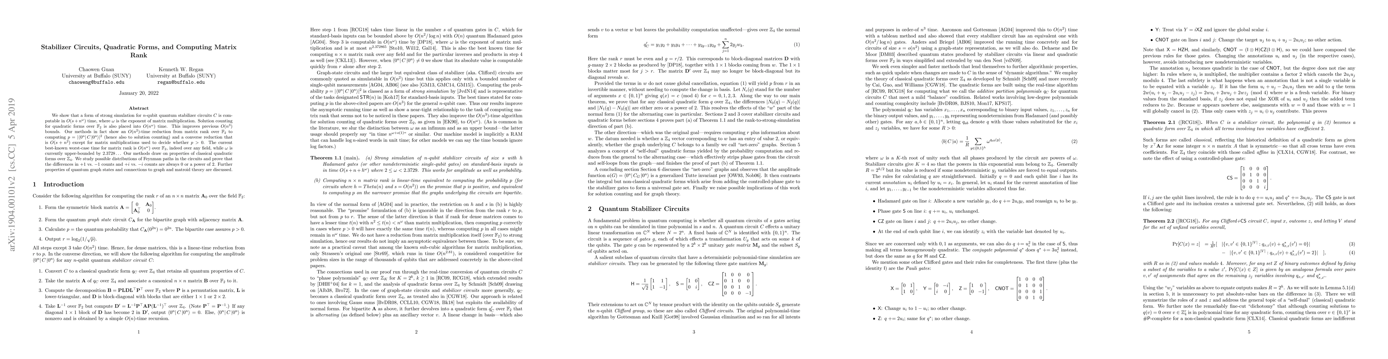 This paper demonstrates efficient computation of strong simulation for $n$-qubit quantum stabilizer circuits and solution counting for quadratic forms over $\mathbb{F}_2$ in $O(n^\omega)$ time, improving previous $O(n^3)$ bounds. It also establishes a reduction from matrix rank computation to the problem of computing the probability amplitude of a specific quantum state, leveraging properties of classical quadratic forms and quantum graph states.