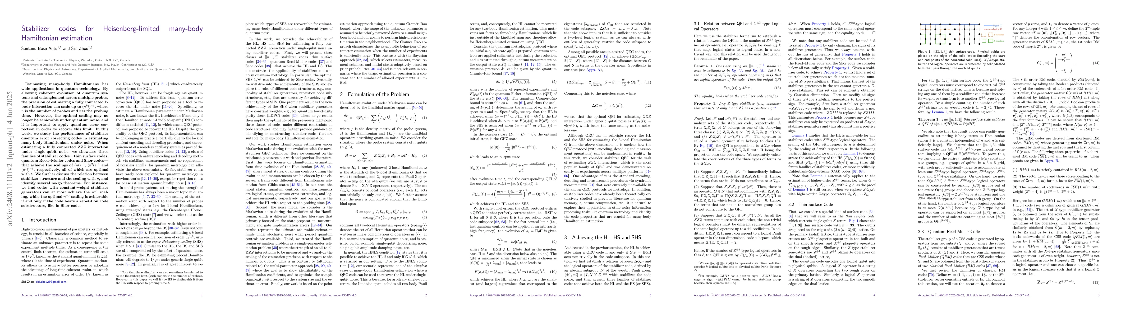Researchers explore how stabilizer quantum error correcting codes can improve the precision of estimating many-body Hamiltonians in quantum technology, achieving optimal scalings of (n^kt)^-1 under certain conditions.