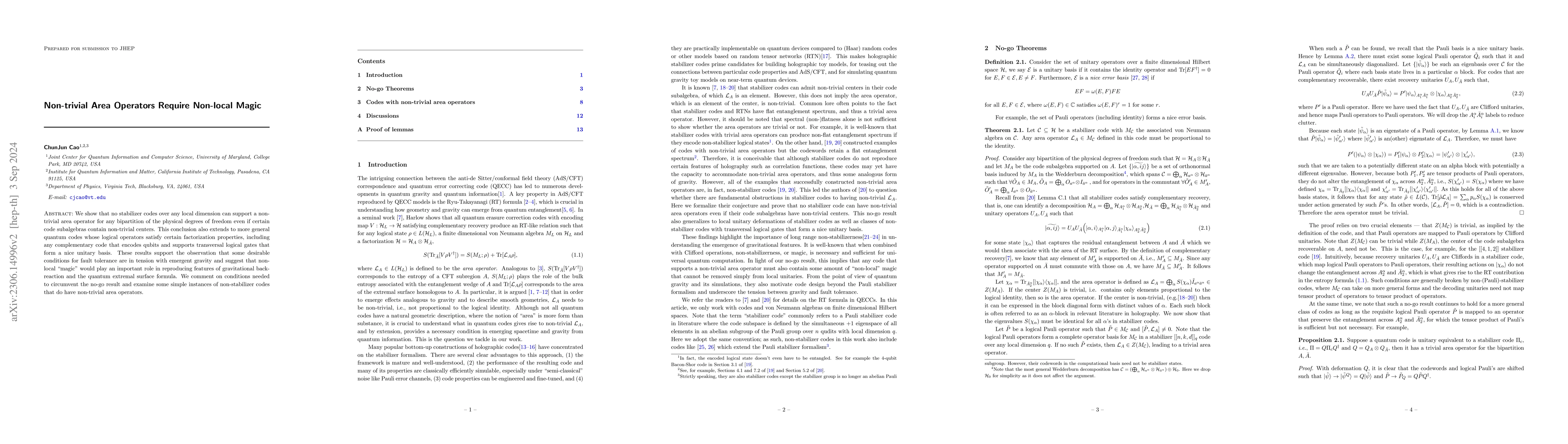 Stabilizer codes cannot support non-trivial area operators for any bipartition, implying non-local "magic" is crucial for certain quantum features. Conditions and a method for creating non-stabilizer codes with such operators are proposed, along with a toy example.