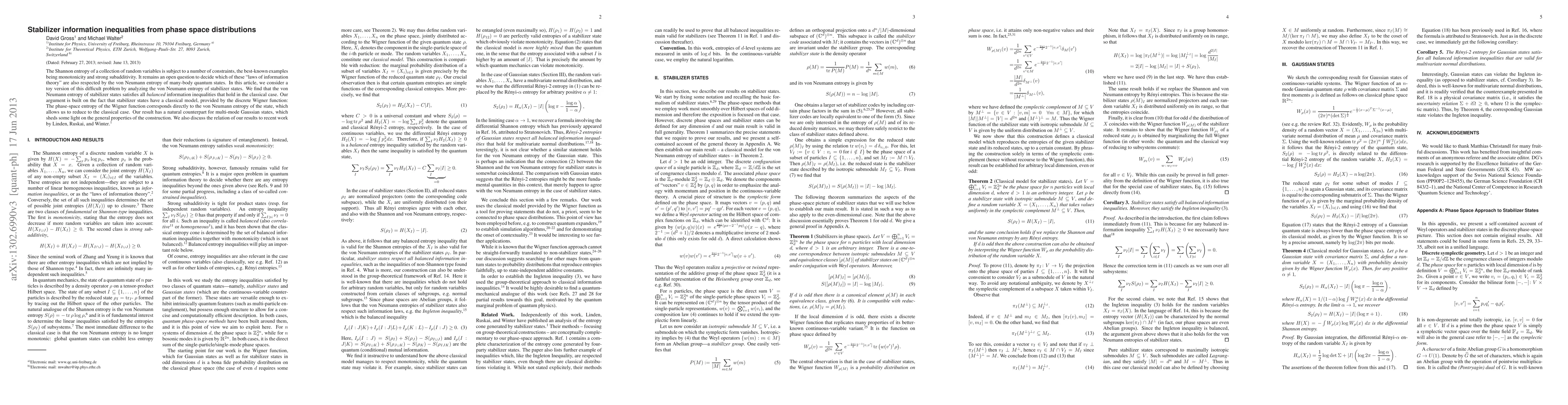 The Shannon entropy of a collection of random variables is subject to a number of constraints, the best-known examples being monotonicity and strong subadditivity. It remains an open question to decide which of these "laws of information theory" are also respected by the von Neumann entropy of many-body quantum states. In this article, we consider a toy version of this difficult problem by analyzing the von Neumann entropy of stabilizer states. We find that the von Neumann entropy of stabilizer states satisfies all balanced information inequalities that hold in the classical case. Our argument is built on the fact that stabilizer states have a classical model, provided by the discrete Wigner function: The phase-space entropy of the Wigner function corresponds directly to the von Neumann entropy of the state, which allows us to reduce to the classical case. Our result has a natural counterpart for multi-mode Gaussian states, which sheds some light on the general properties of the construction. We also discuss the relation of our results to recent work by Linden, Ruskai, and Winter.