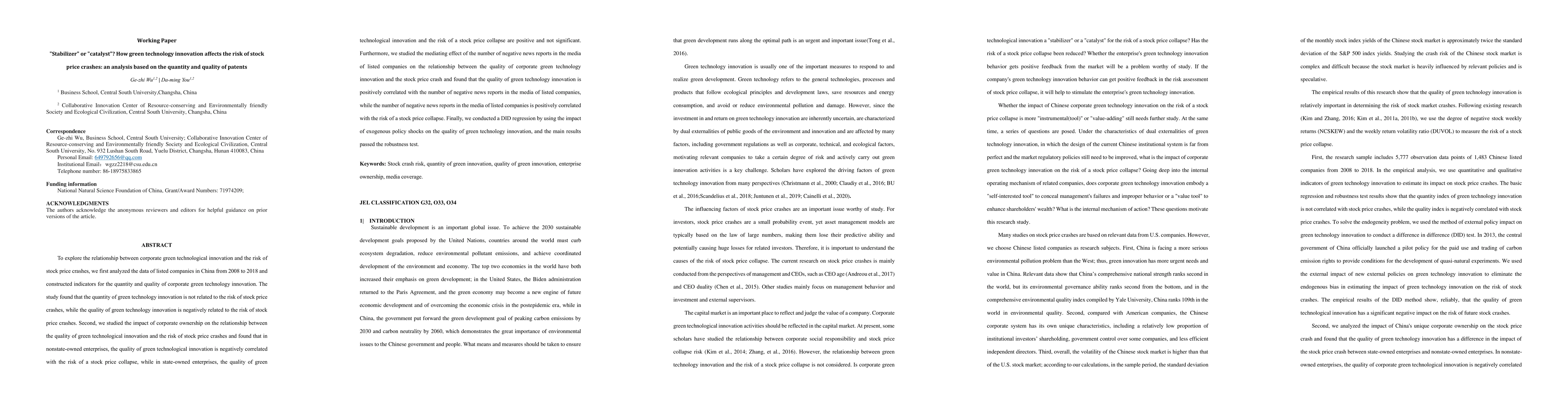This paper investigates the relationship between corporate green technology innovation and stock price crash risk in Chinese listed companies from 2008 to 2018. It finds that while the quantity of green innovation does not affect crash risk, the quality of such innovation is negatively correlated with it. The study also reveals that this effect is stronger in nonstate-owned enterprises and is mediated by the number of negative news reports.