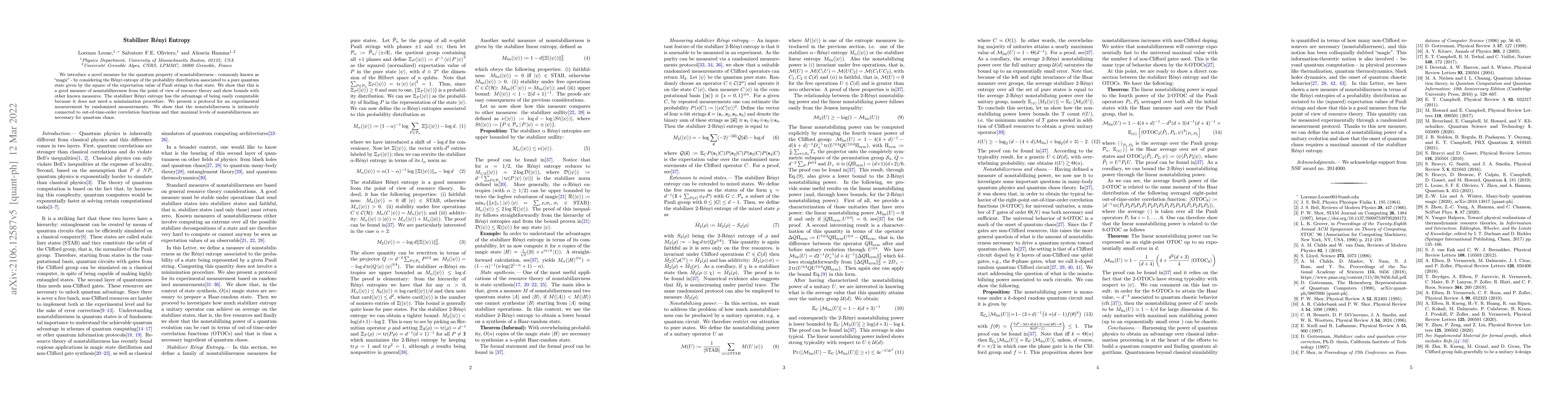 This paper introduces a new measure called stabilizer R\'enyi entropy to quantify nonstabilizerness in quantum states, showing it is easily computable and connected to resource theory. It also proposes a protocol for experimental measurement and links maximal nonstabilizerness to quantum chaos.