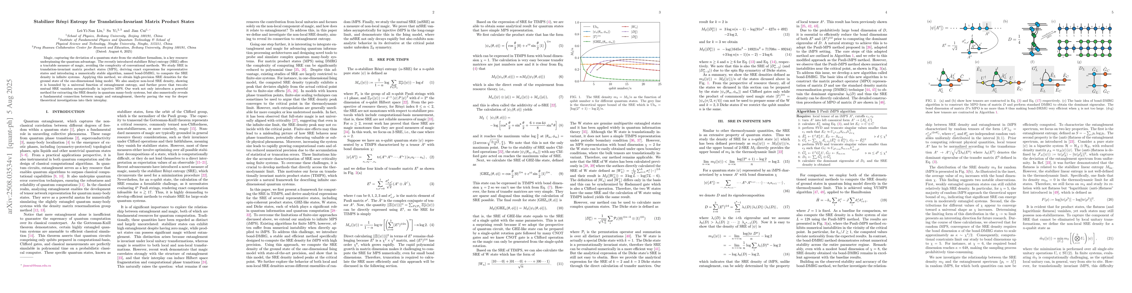 Magic, capturing the deviation of a quantum state from the stabilizer formalism, is a key resource underpinning the quantum advantage. The recently introduced stabilizer R\'enyi entropy (SRE) offers a tractable measure of magic, avoiding the complexity of conventional methods. We study SRE in translation-invariant matrix product states (MPS), deriving exact expressions for representative states and introducing a numerically stable algorithm, named bond-DMRG, to compute the SRE density in infinite systems. Applying this method, we obtain high-precision SRE densities for the ground state of the one-dimensional Ising model. We also analyze non-local SRE density, showing it is bounded by a universal function of entanglement entropy, and further prove that two-site mutual SRE vanishes asymptotically in injective MPS. Our work not only introduces a powerful method for extracting the SRE density in quantum many-body systems, but also numerically reveals a fundamental connection between magic and entanglement, thereby paving the way for deeper theoretical investigations into their interplay.