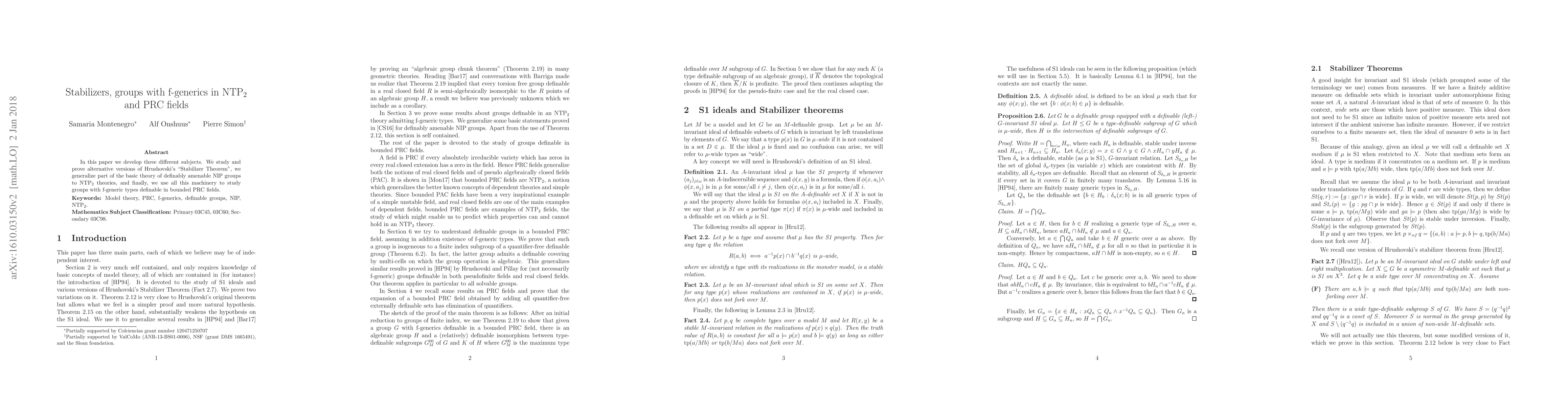 The paper develops three subjects: alternative versions of Hrushovski's 'Stabilizer Theorem', generalization of definably amenable NIP groups to NTP2 theories, and application to groups with f-generic types in bounded PRC fields.