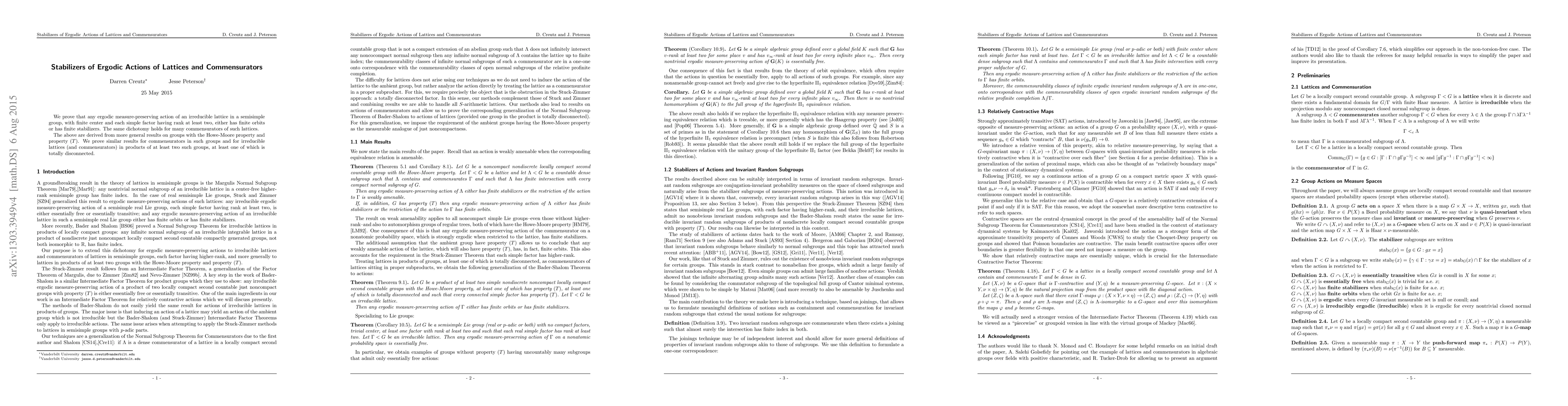 This paper demonstrates that ergodic actions of irreducible lattices in semisimple groups with specific conditions either have finite stabilizers or finite orbits. The results also extend to commensurators of such lattices and groups with the Howe-Moore property and property $(T)$.
