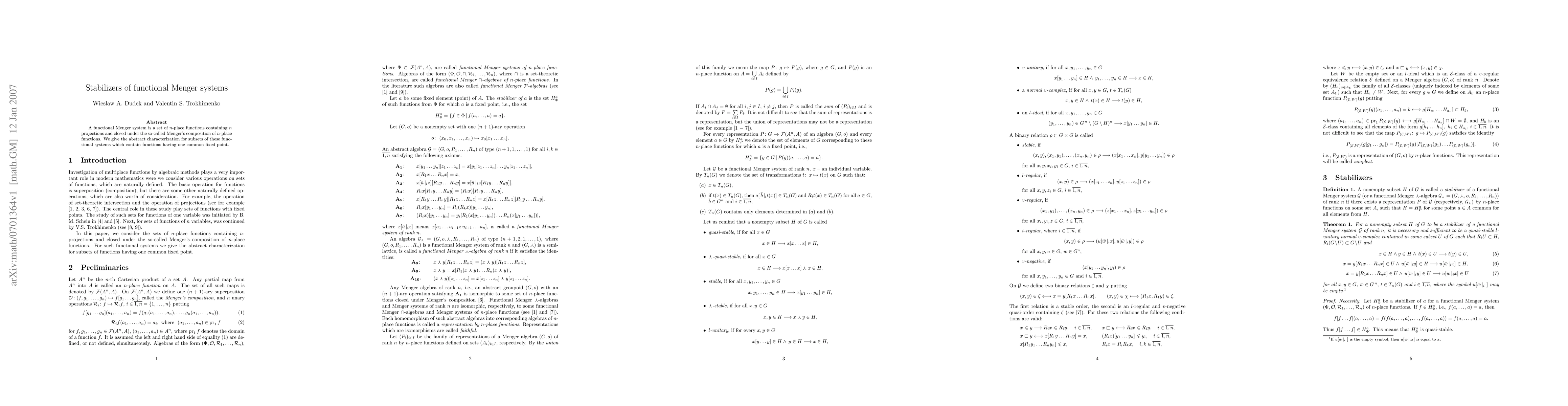 This research identifies and characterizes subsets within functional Menger systems, specifically those containing functions sharing a common fixed point. It provides an abstract description of these stabilizers, contributing to understanding the structure and behavior of such complex function systems.