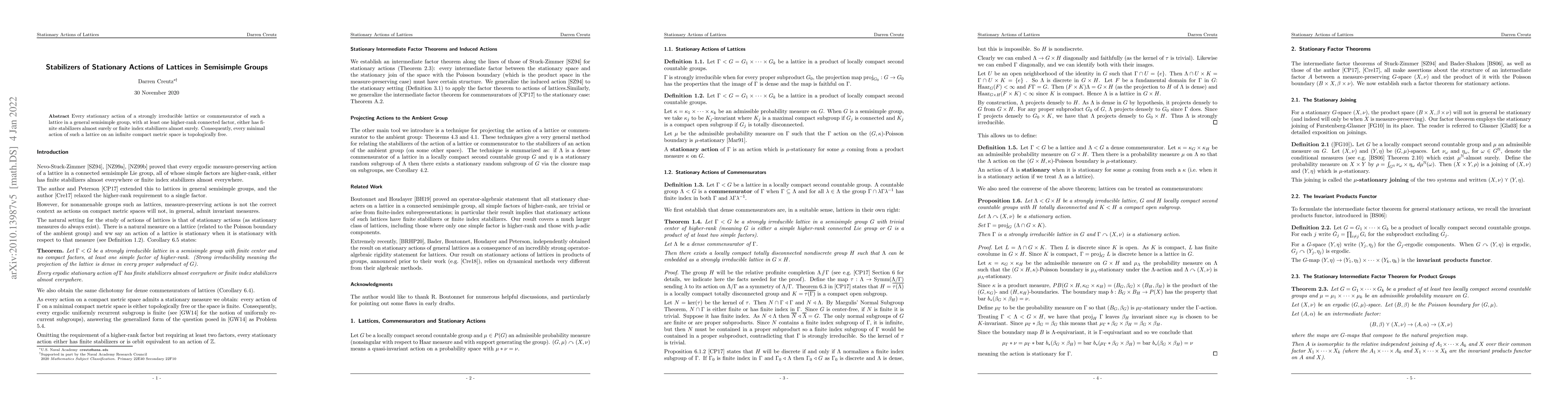 This paper investigates stationary actions of strongly irreducible lattices in semisimple groups, demonstrating that such actions almost surely have stabilizers that are either finite or have finite index.