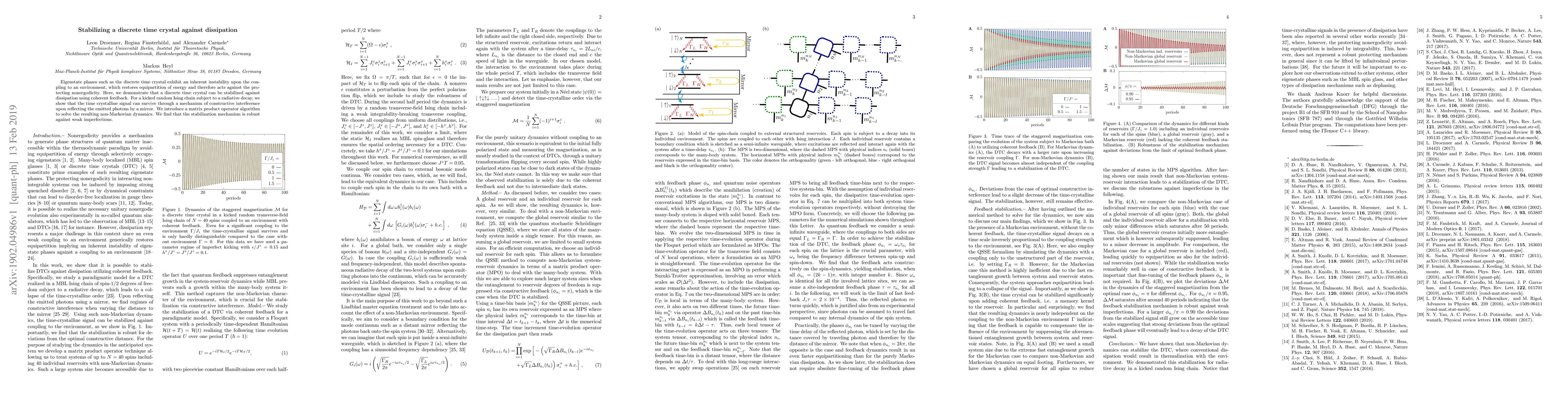 This paper demonstrates how coherent feedback can stabilize a discrete time crystal against dissipation, showing that constructive interference from reflected emitted photons can maintain the time crystalline signal in a kicked random Ising chain. The study employs a matrix product operator algorithm to model the non-Markovian dynamics and finds the stabilization robust against minor imperfections.