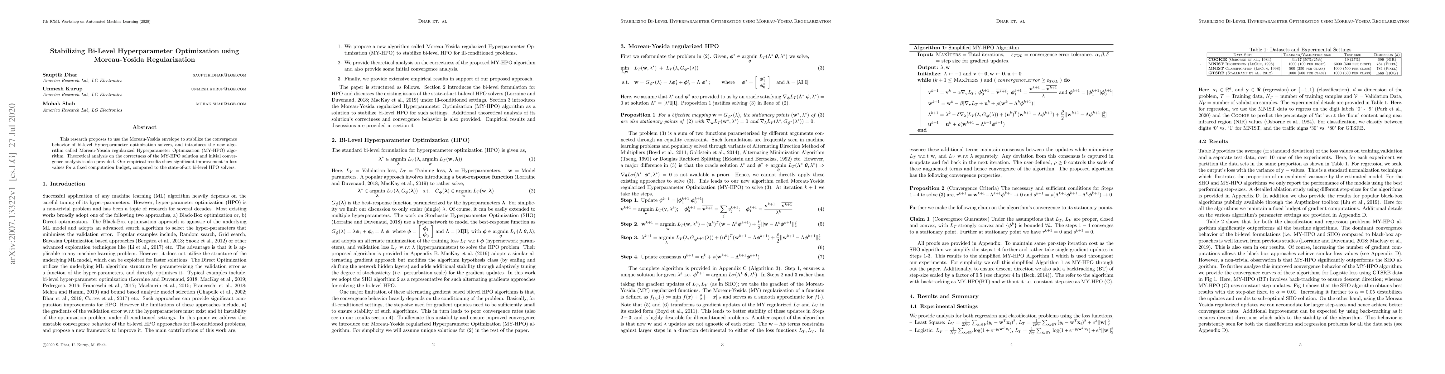 This paper introduces the Moreau-Yosida regularized Hyperparameter Optimization (MY-HPO) algorithm to stabilize bi-level hyperparameter optimization, providing theoretical correctness and initial convergence analysis. Empirical results demonstrate notable improvements in loss values compared to state-of-the-art solvers.