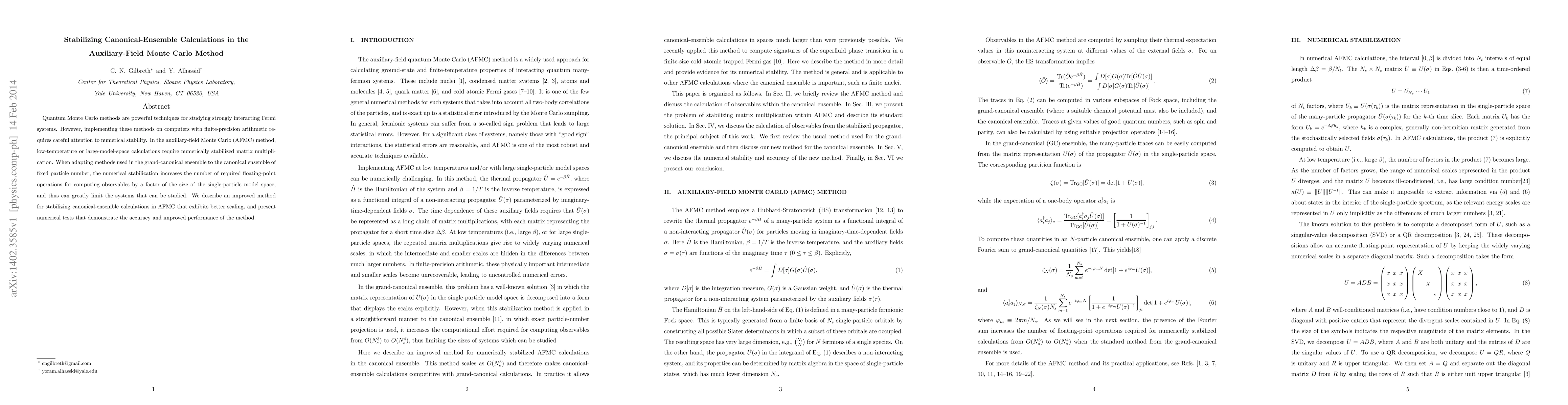 This paper presents an improved method for stabilizing matrix multiplication in the auxiliary-field Monte Carlo (AFMC) method for canonical-ensemble calculations, addressing numerical stability issues in strongly interacting Fermi systems. The new approach shows better scaling and enhanced performance compared to previous methods.