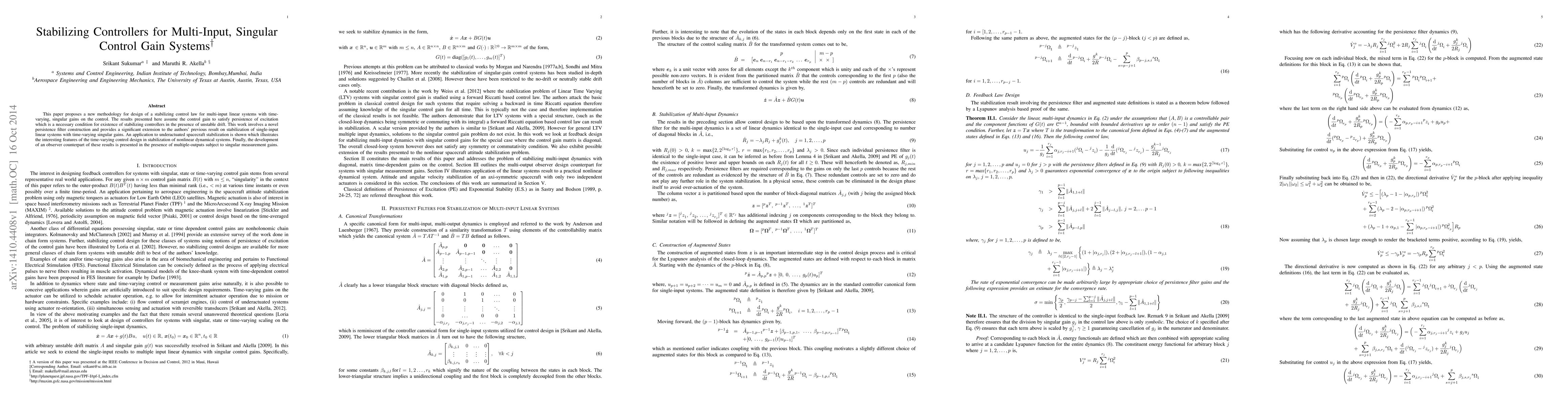 This paper proposes a new methodology for design of a stabilizing control law for multi-input linear systems with time-varying, singular gains on the control. The results presented here assume the control gain to satisfy persistence of excitation which is a necessary condition for existence of stabilizing controllers in the presence of unstable drift. This work involves a novel persistence filter construction and provides a significant extension to the authors' previous result on stabilization of single-input linear systems with time-varying singular gains. An application to underactuated spacecraft stabilization is shown which illustrates the interesting features of the time-varying control design in stabilization of nonlinear dynamical systems. Finally, the development of an observer counterpart of these results is presented in the presence of multiple-outputs subject to singular measurement gains.