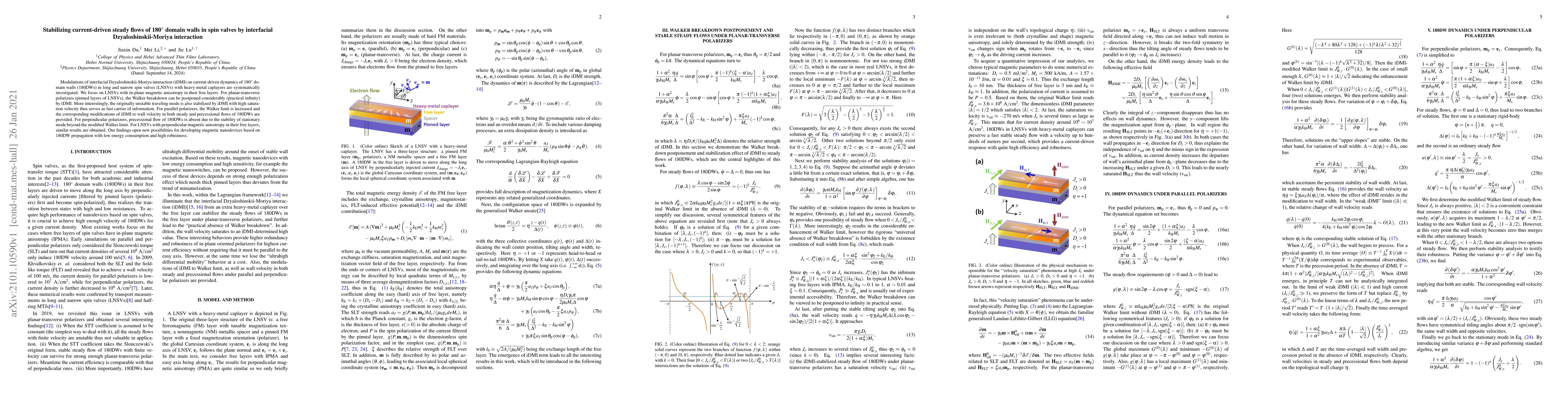 Modulations of interfacial Dzyaloshinskii-Moriya interaction (iDMI) on current-driven dynamics of 180$^{\circ}$ domain walls (180DWs) in long and narrow spin valves (LNSVs) with heavy-metal caplayers are systematically investigated. We focus on LNSVs with in-plane magnetic anisotropy in their free layers. For planar-transverse polarizers (pinned layers of LNSVs), the Walker breakdown can be postponed considerably (practical infinity) by iDMI. More interestingly, the originally unstable traveling mode is also stabilized by iDMI with high saturation velocity thus serves as fast carrier of information. For parallel polarizers, the Walker limit is increased and the corresponding modifications of iDMI to wall velocity in both steady and precessional flows of 180DWs are provided. For perpendicular polarizers, precessional flow of 180DWs is absent due to the stability of stationary mode beyond the modified Walker limit. For LNSVs with perpendicular magnetic anisotropy in their free layers, similar results are obtained. Our findings open new possibilities for developing magnetic nanodevices based on 180DW propagation with low energy consumption and high robustness.